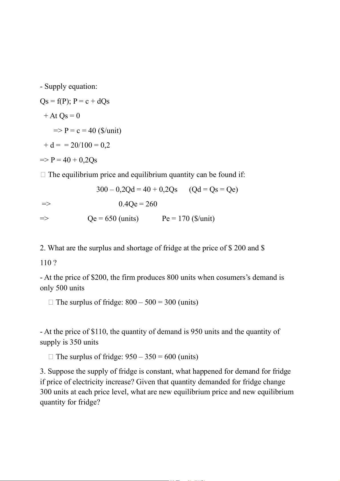 1. What are the demand and supply equations, equilibrium price and equilibrium quantity for fridge ? 250 200 ) it 150 ($/un 100 rice P 50 00 2 4 6 8 10 12 14 Quantity (Units) - Demand equation: Qd = f(P); P = a – bQd + At Qd = 0 => P = a = 300 ($/unit) + b = = 20/100 = 0,2 => P = 300 – 0,2Qd - Supply equation: Qs = f(P); P = c + dQs + At Qs = 0 => P = c = 40 ($/unit) + d = = 20/100 = 0,2 => P = 40 + 0,2Qs