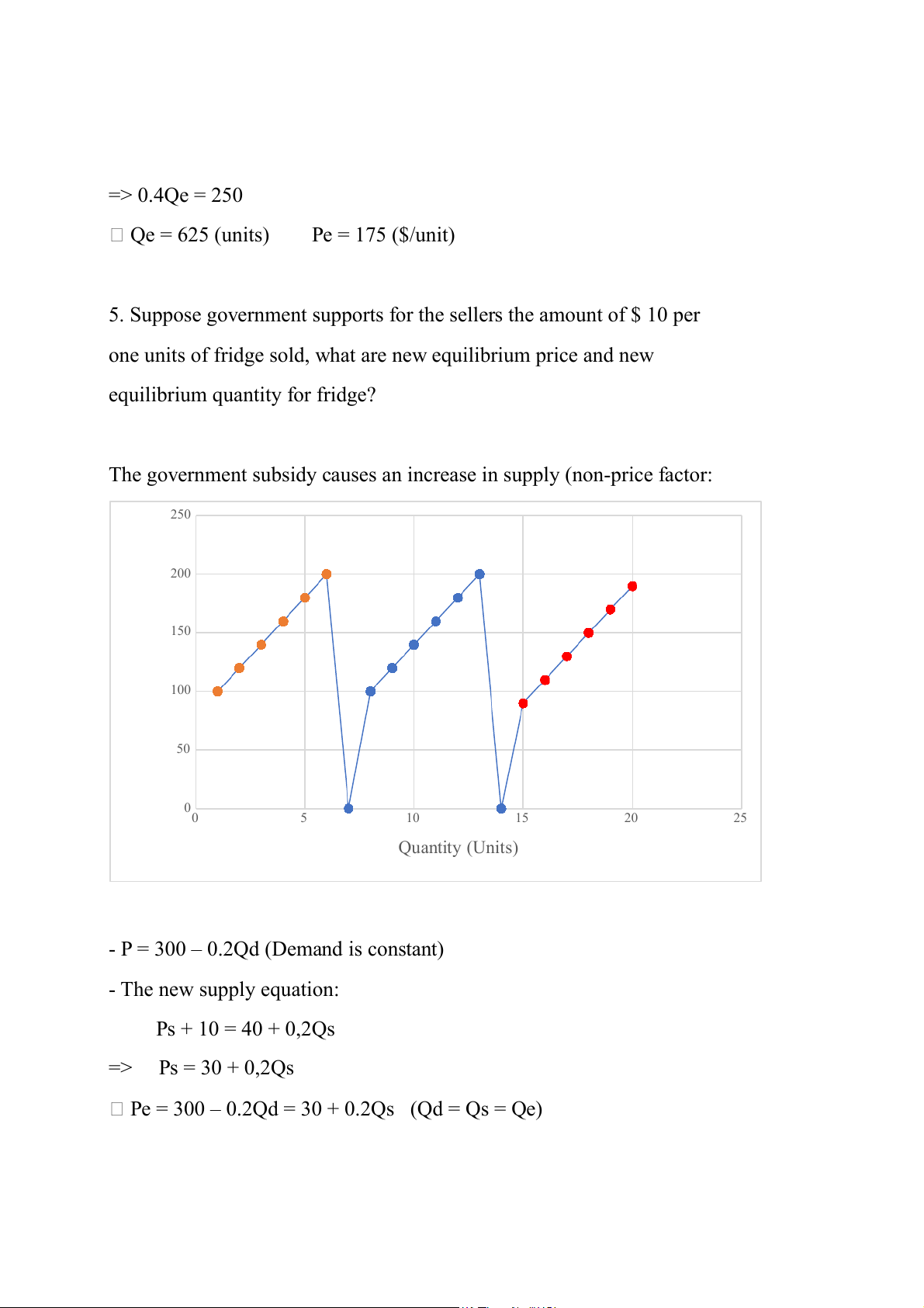 - Pd = 300 – 0.2Qd (Demand is constant) - The new supply equation: Ps - 10 = 40 + 0,2Qs => Ps = 50 + 0,2Qs