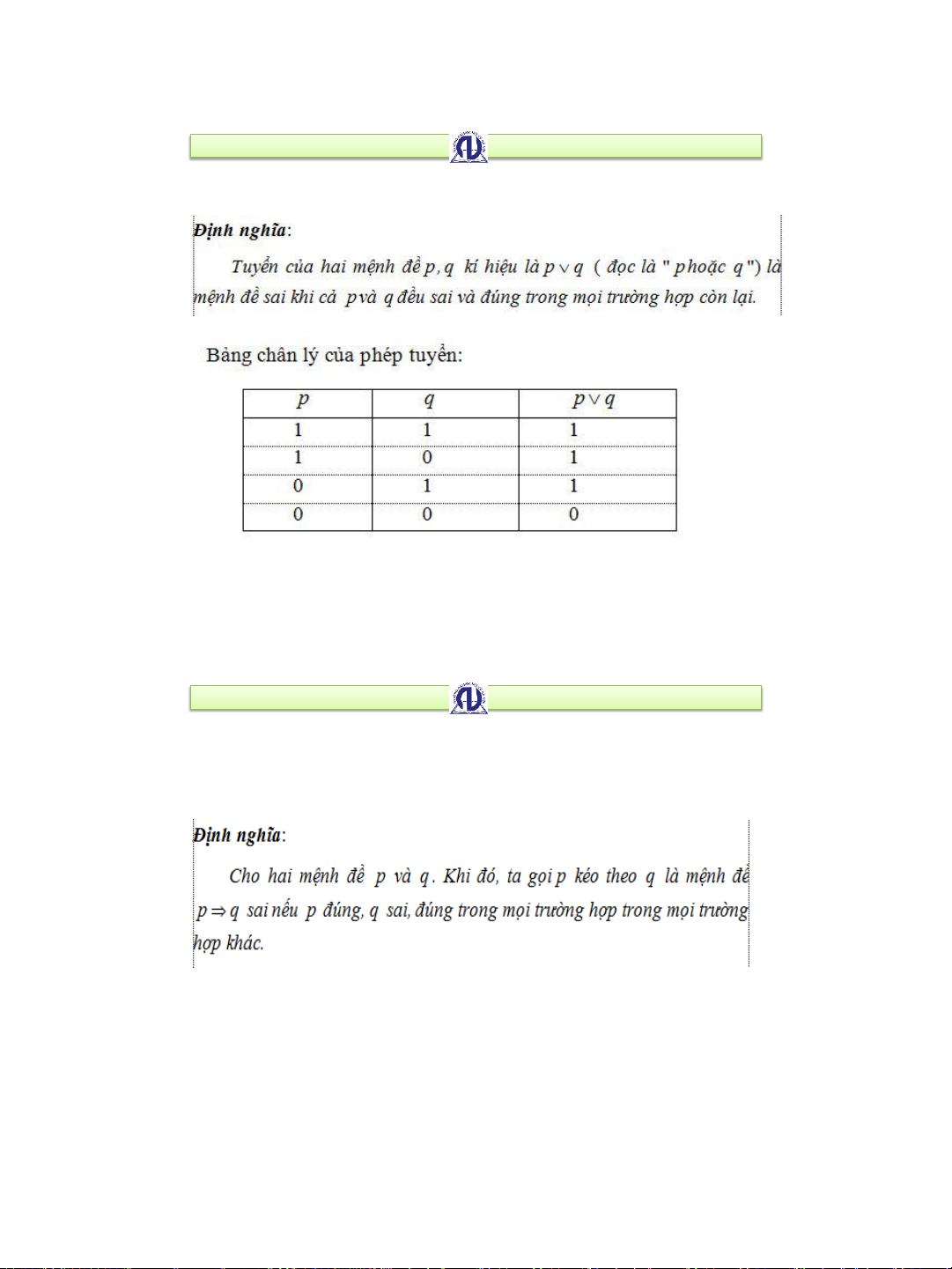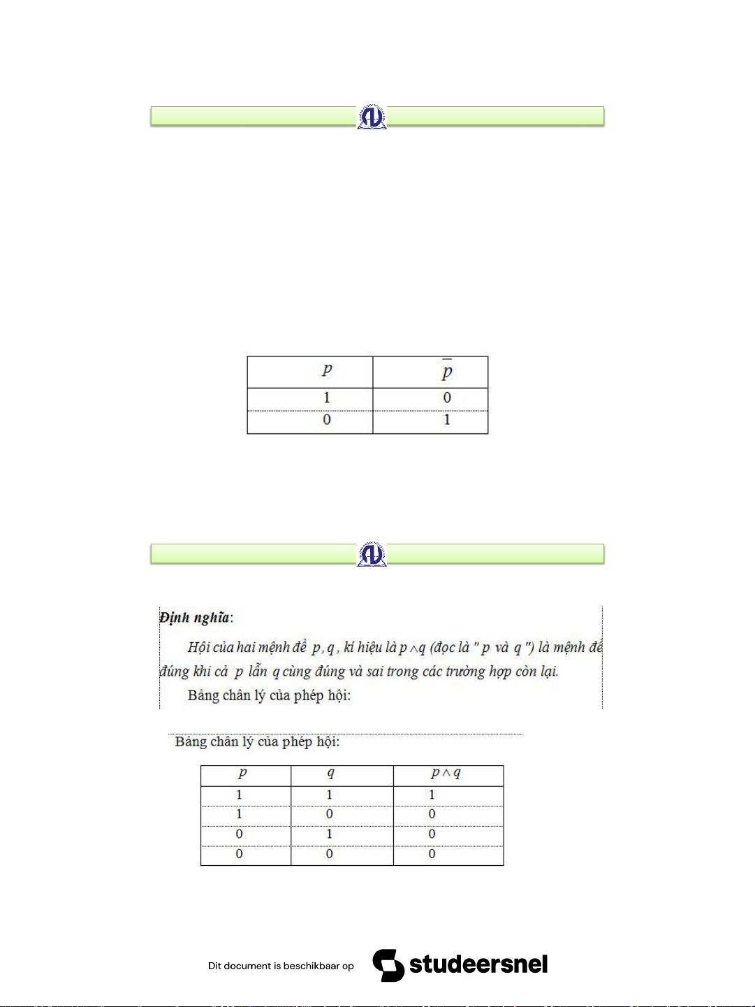 Các giá trị 1; 0 gọi là giá trị chân lý hay chân trị của mệnh đề 8