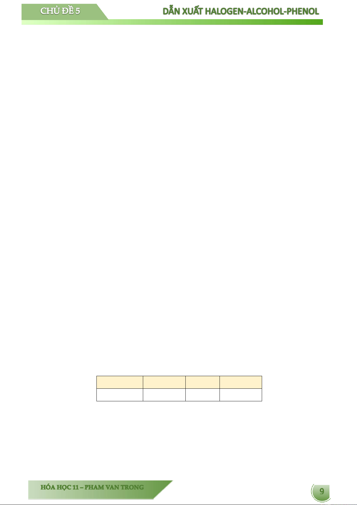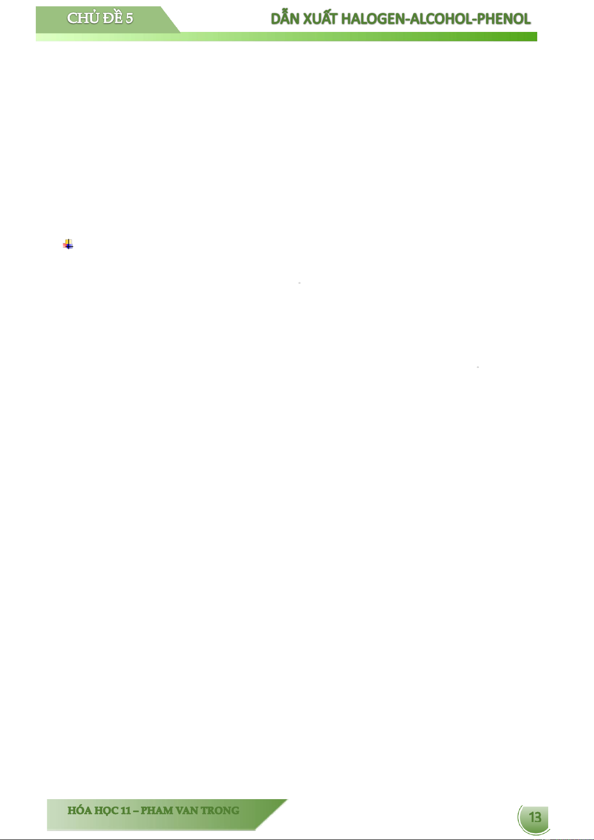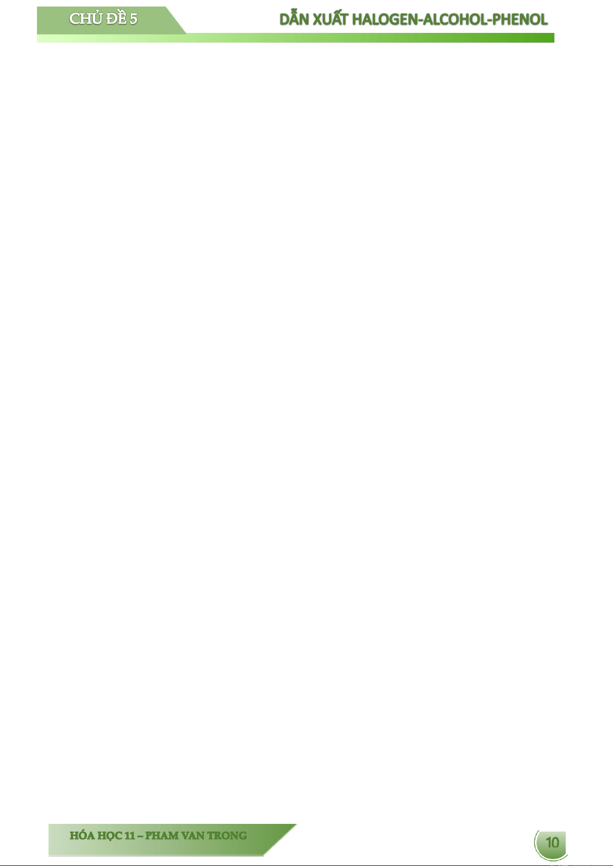Câu 1. [SBT – KNTT]: Công thức tổng quát của dẫn xuất monochlorine no, mạch hở là A. C H Cl C H Cl C H Cl C H Cl n 2n − . B. 5 n 2n − . C. 3 n 2n 1 − . D. n 2n 1 + .