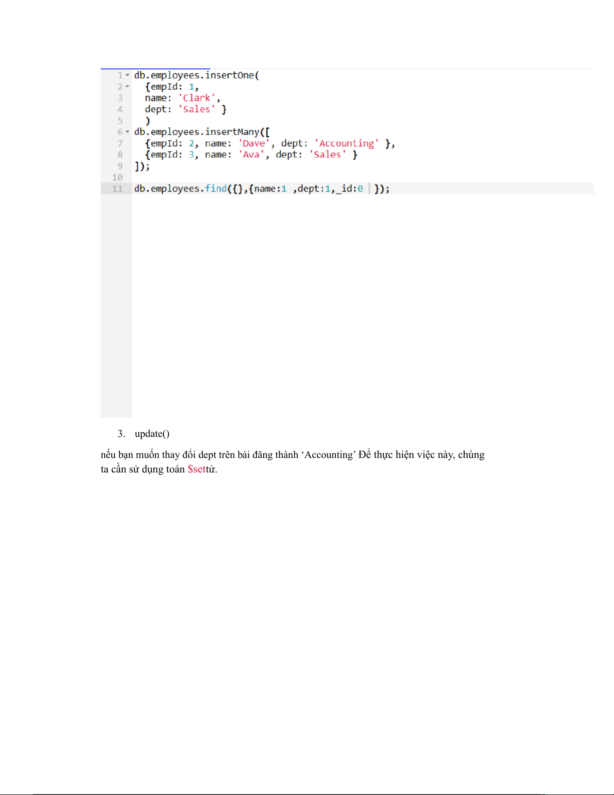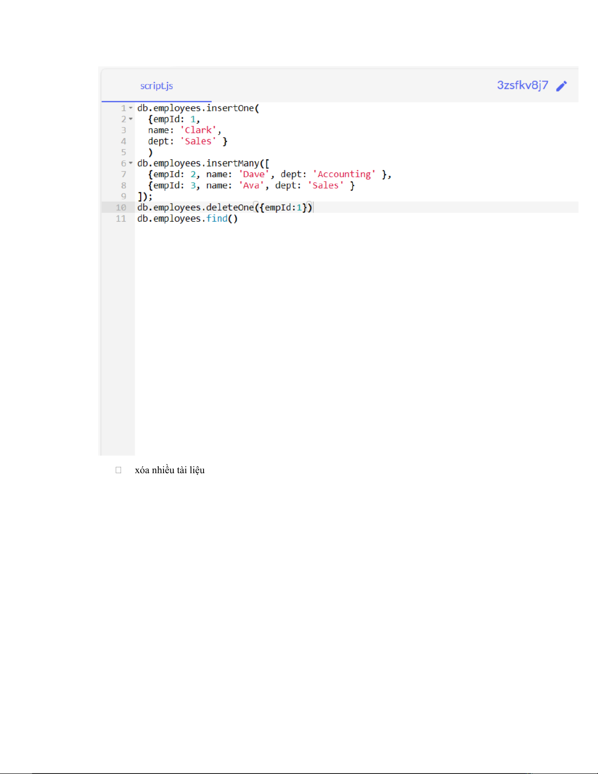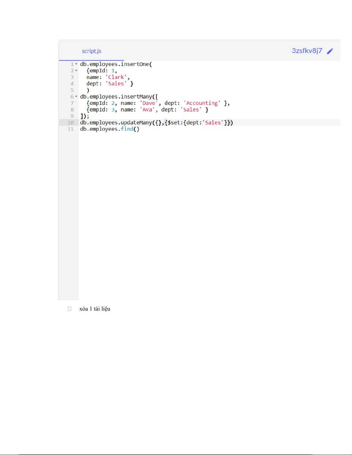 cập nhật nhiều dữ liệu xóa 1 tài liệu xóa nhiều tài liệu xóa tất cả 4. aggregate 5. createIndex