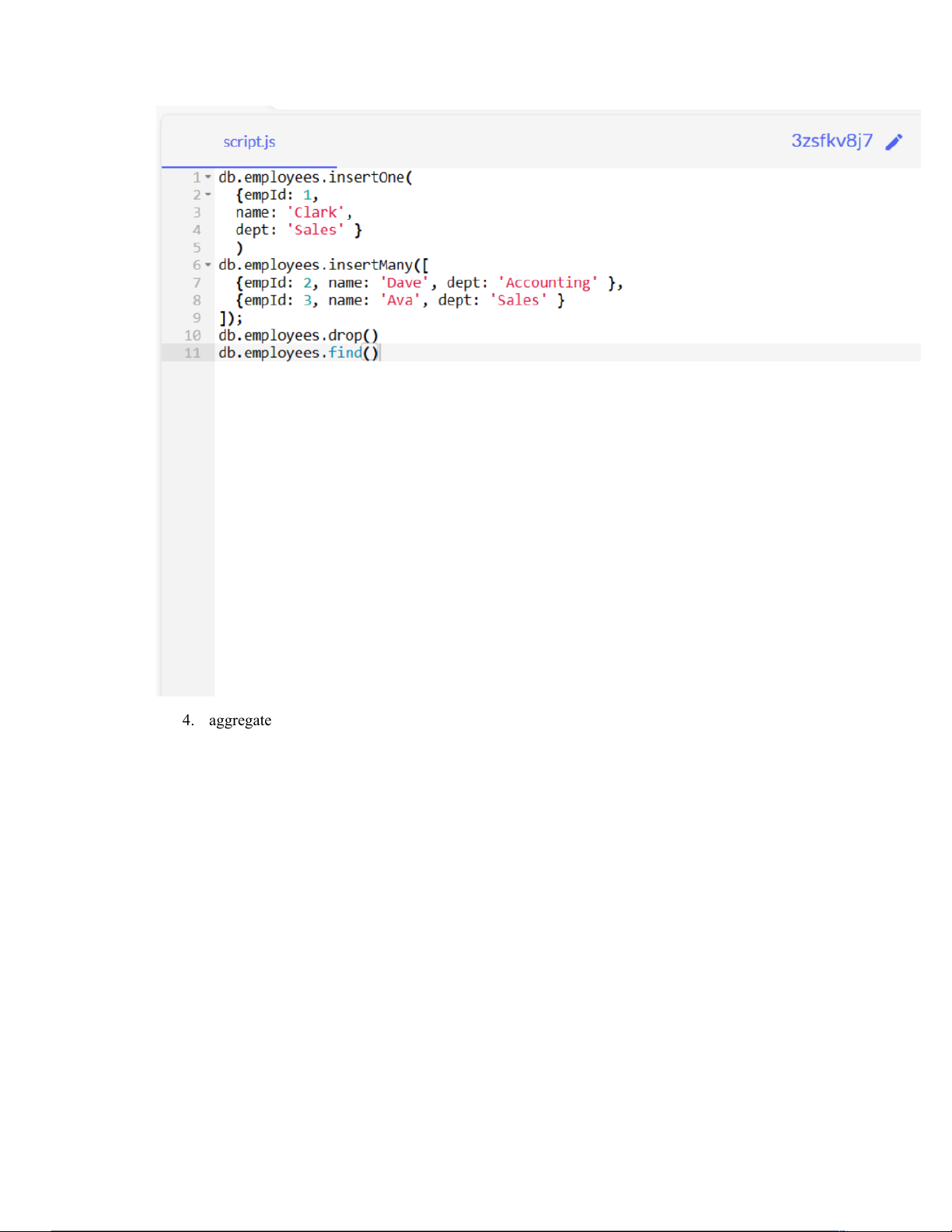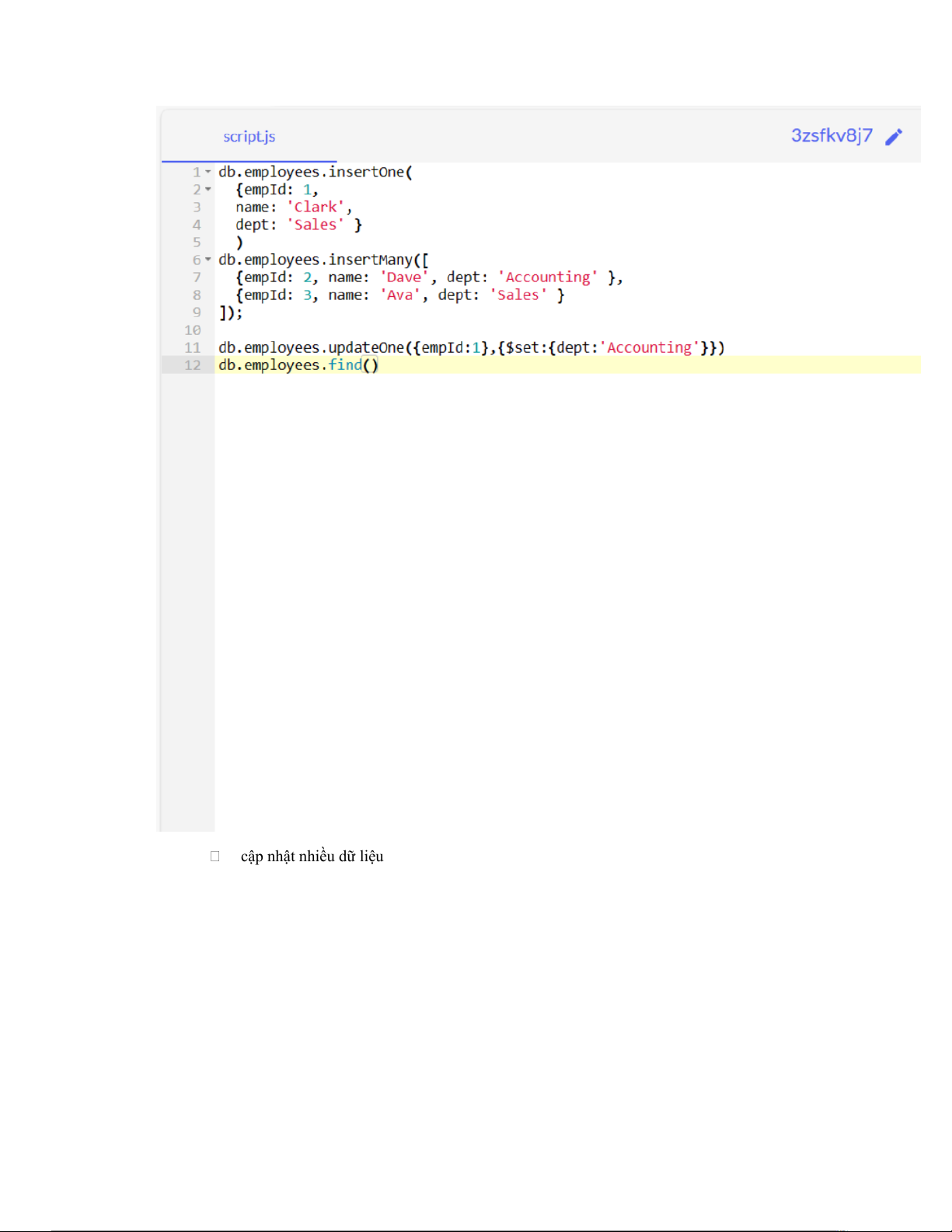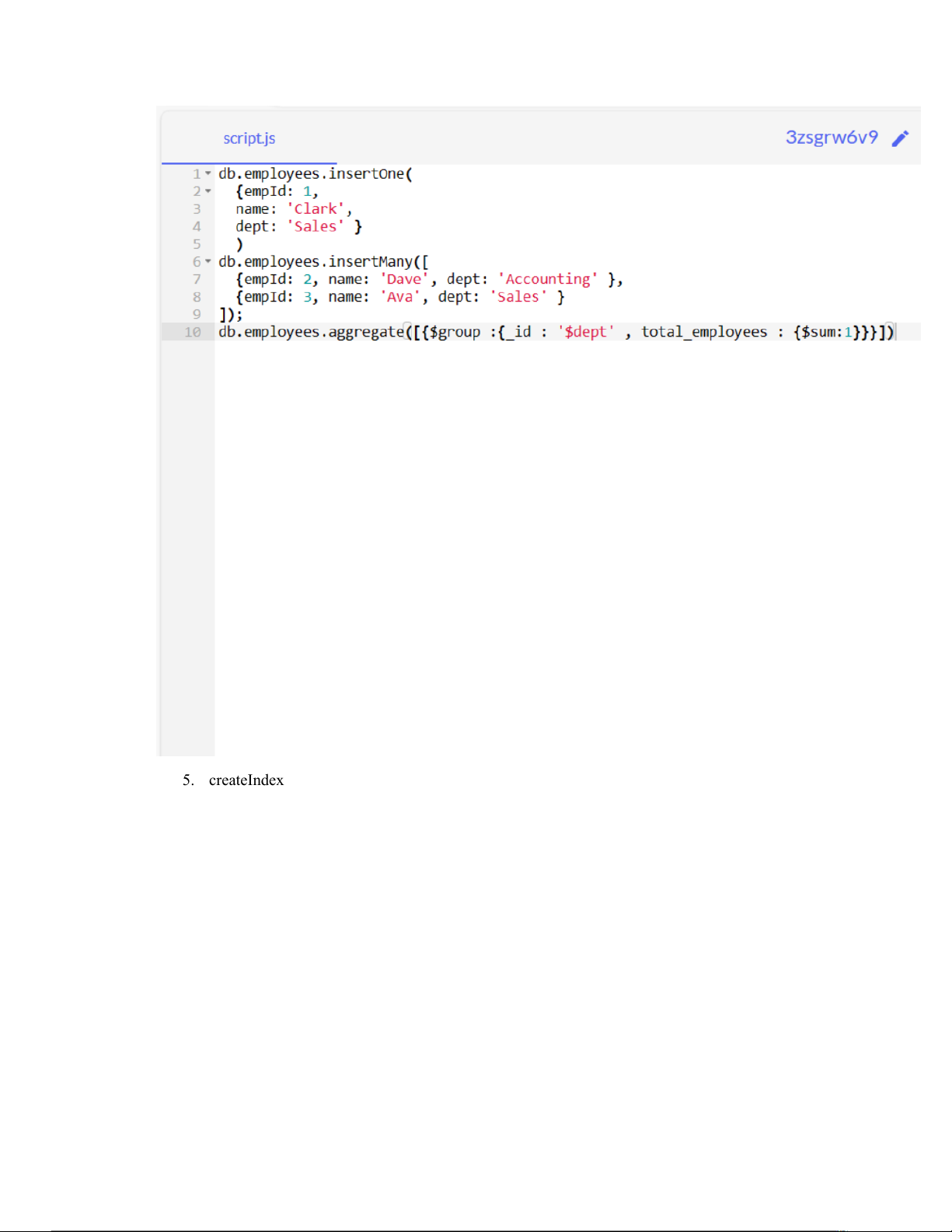 cập nhật nhiều dữ liệu xóa 1 tài liệu xóa nhiều tài liệu xóa tất cả 4. aggregate 5. createIndex