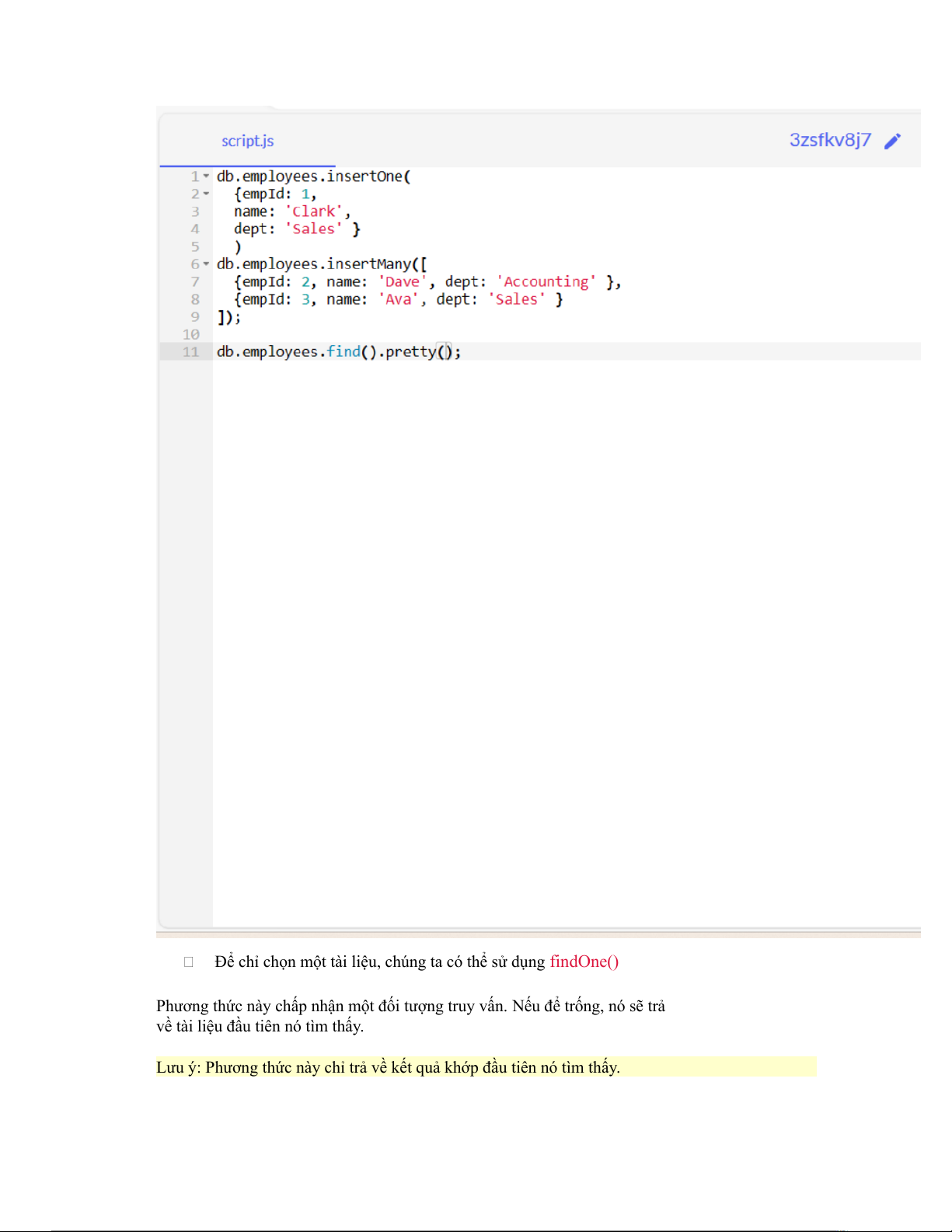 Để chỉ chọn một tài liệu, chúng ta có thể sử dụng findOne()