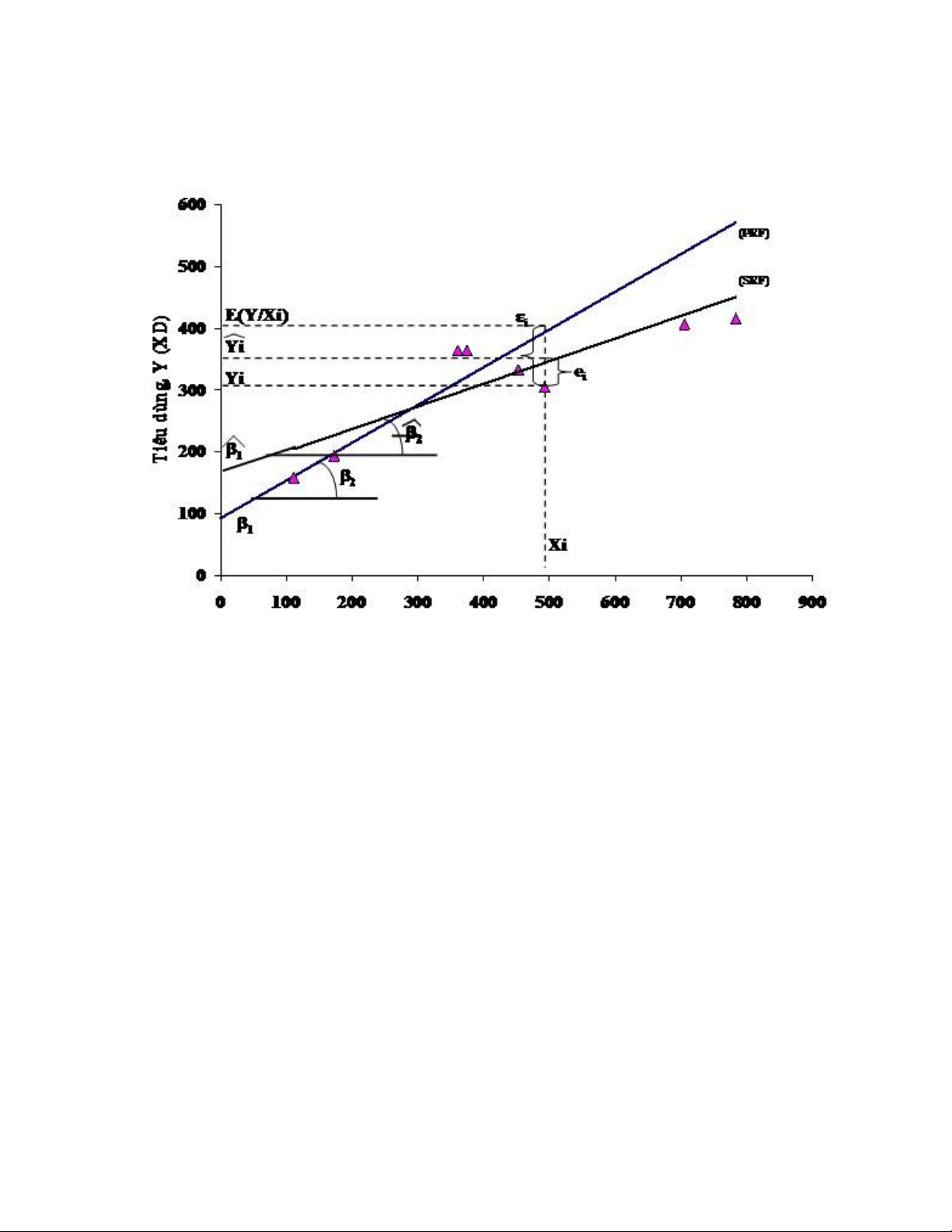 Hình 3.3 cho thấy sự xấp xỉ của hàm hồi quy mẫu (SRF) và hàm hồi quy tổng thể (PRF). Thu nhập X (XD)