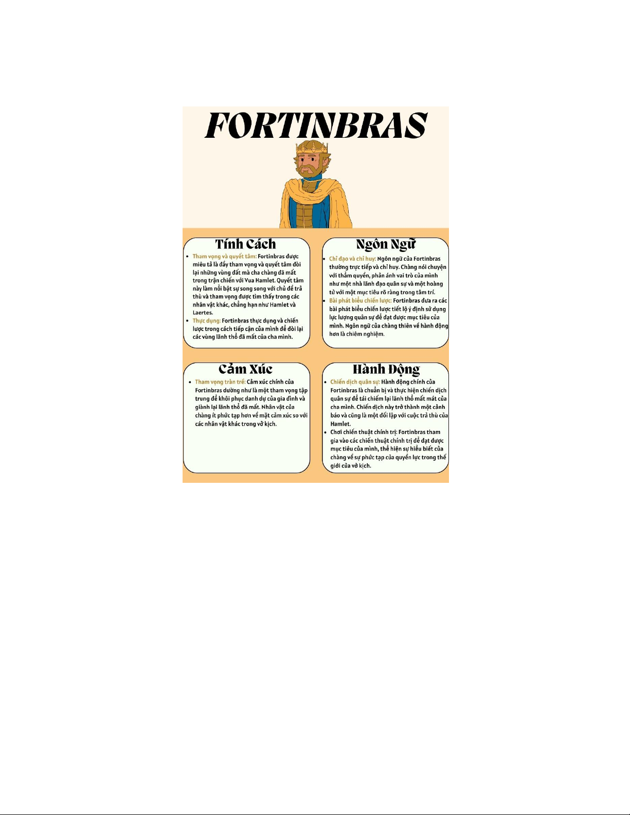 nhưng cuối cùng vẫn là dẫn đến hậu quả bi thảm cho nhiều nhân vật. 5. Fortinbras + Tính cách: •