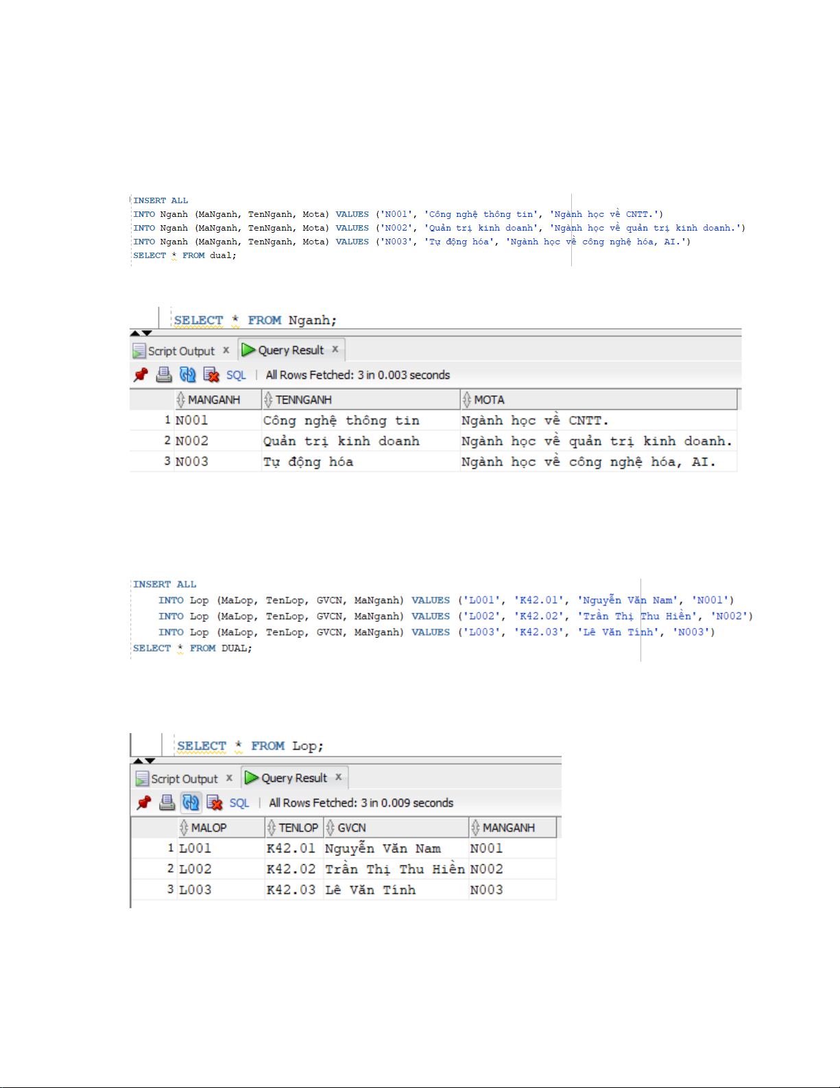 Downloaded by 32. Nguy?n V?n Thi?u (nguyenvanthieu2005.qv@gmail.com) lOMoARcPSD|25731242 2. Tạo bảng Tạo bảng Nganh: Tạo bảng Lop: