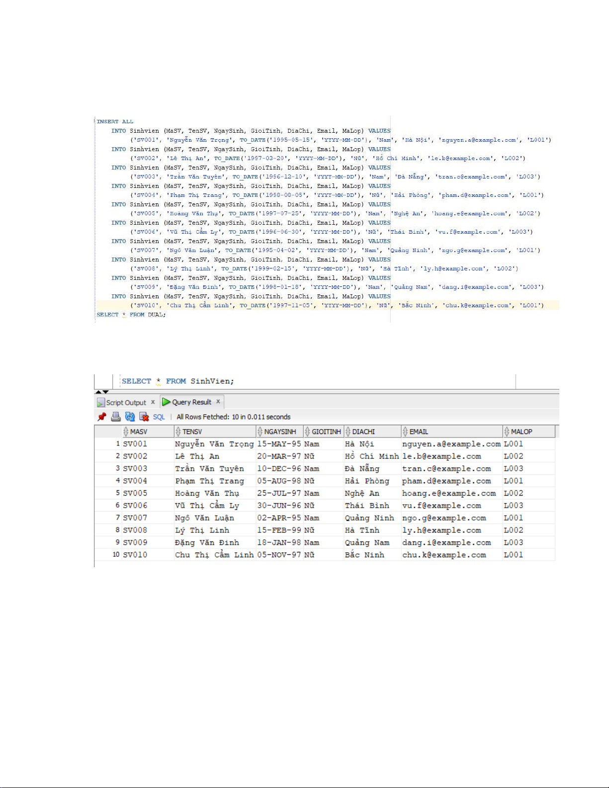 Thêm dữ liệu cho bảng SinhVien: 16