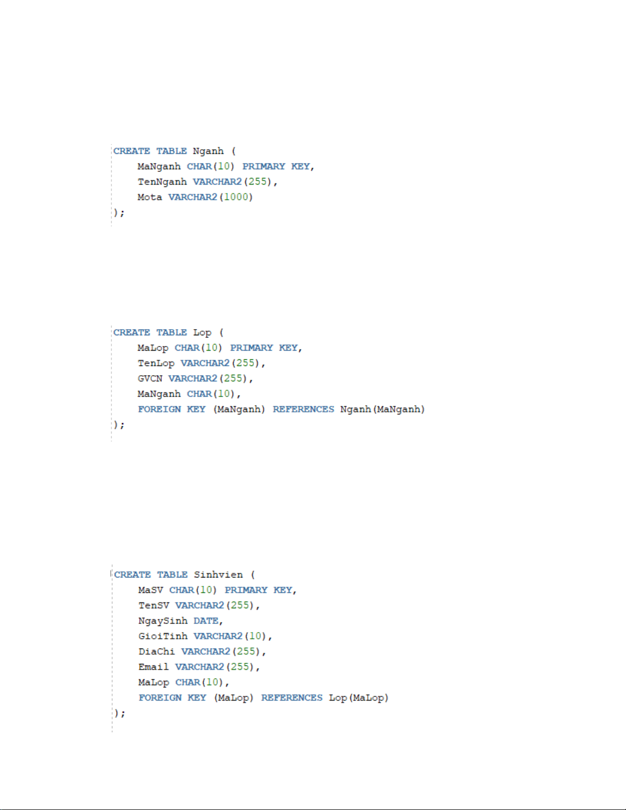 1.3 Xác định cấu trúc bảng Bảng Nganh STT Tên thuộc tính Kiểu dữ liệu Ràng buộc Ghi chú 1 MaNganh CHAR(15) PK Mã Ngành 2 TenNganh VARCHAR2(255 Tên Ngành ) 3 Mota VARCHAR2(255 Mô tả ) Bảng Lop STT Tên thuộc tính Kiểu dữ liệu Ràng buộc Ghi chú 1 MaLop CHAR(15) PK Mã Lớp 2 TenLop VARCHAR2(255) Tên Lớp 3 GVCN VARCHAR2(255) Giáo viên chủ nhiệm 4 MaNganh CHAR(15) FK Mã Ngành khóa ngoại Bảng SinhVien STT Tên thuộc tính Kiểu dữ liệu Ràng buộc Ghi chú 1 MaSV CHAR(15) PK Mã sinh viên 2 TenSV VARCHAR2(255 Tên sinh viên ) 10