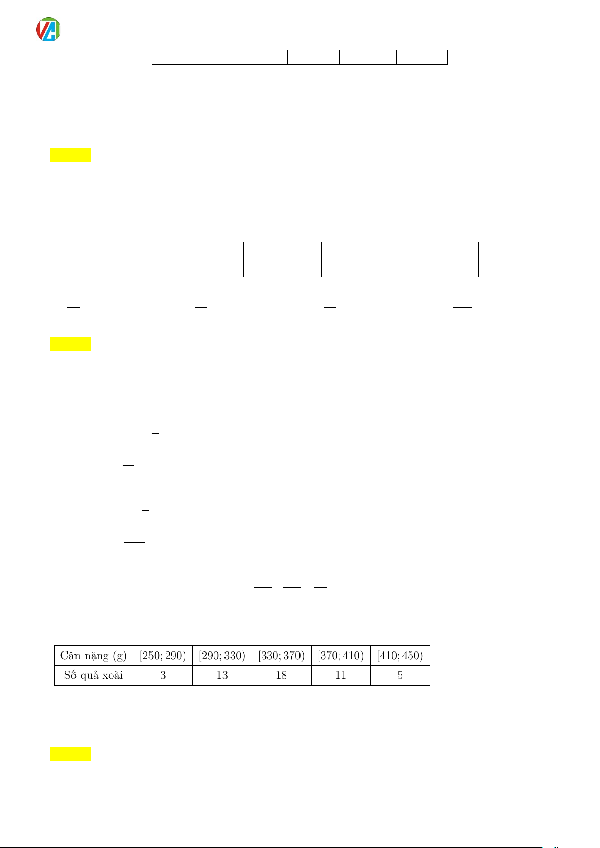 Câu 19. Bảng sau thống kê cân nặng của 50 quả xoài Thanh Ca được lựa chọn ngẫu nhiên sau khi thu