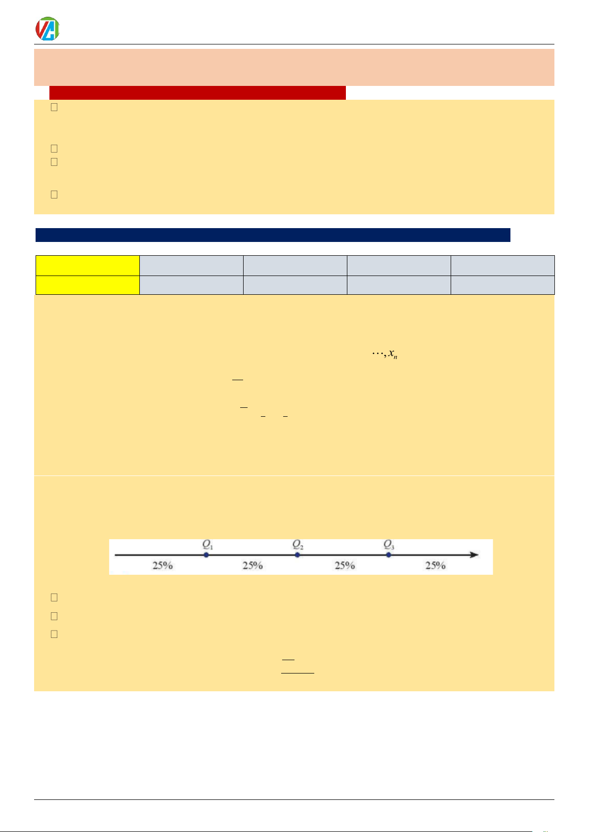 C = n + n ++ n (Tổng tần số các nhóm trước nhóm chứa tứ phân vị gọi là tần số tích lũy). 1 2 m 1 − .in −C 4 Q = u + u − u i m ( m 1 m ) n + m 0983.900.570 3 2025-2026 Võ Công Trường Toán 12_Thống kê
