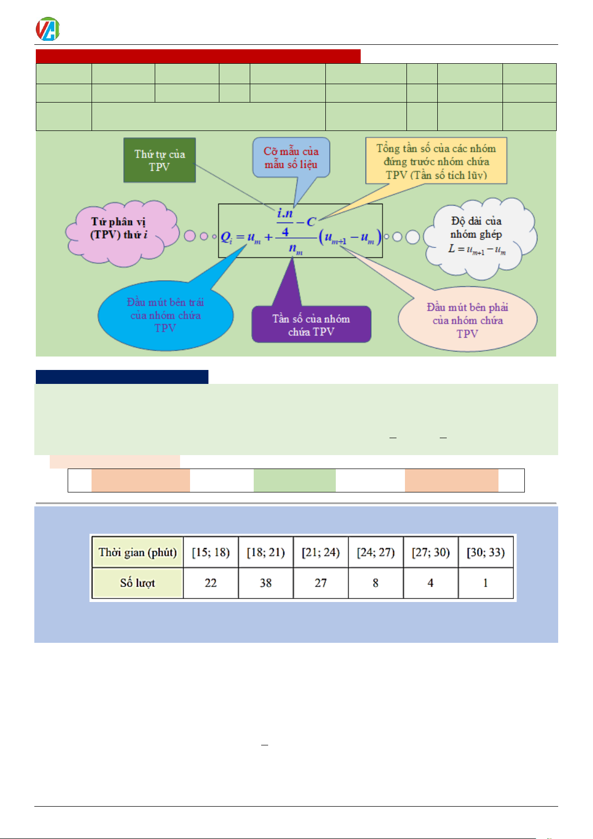 QUY TẮC TÌM CÁC TỨ PHÂN VỊ VÀ KHOẢNG TỨ PHÂN VỊ CỦA MẪU SỐ LIỆU GHÉP NHÓM Nhóm u ;u u ;u u ;u k k 1 + ) 2 3 ) 1 2 ) Tần số n n n 1 2 k
