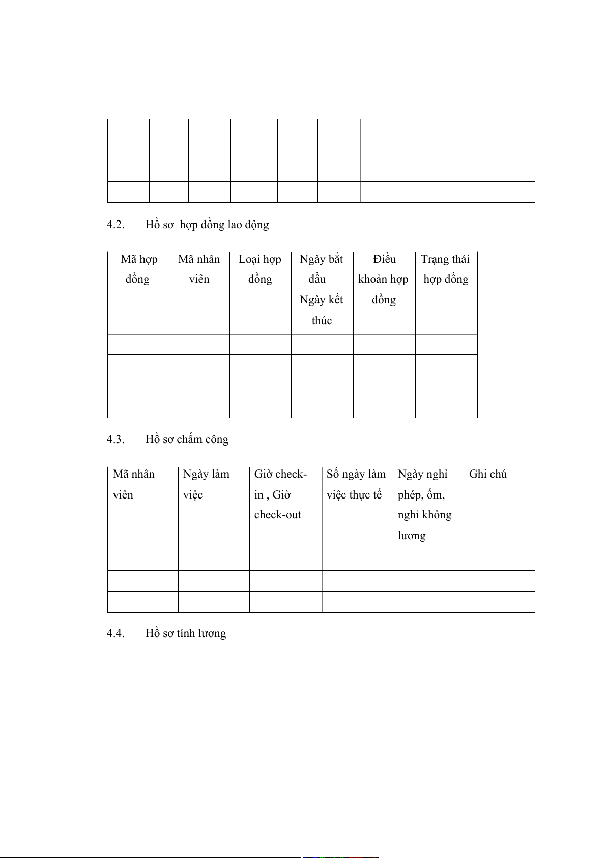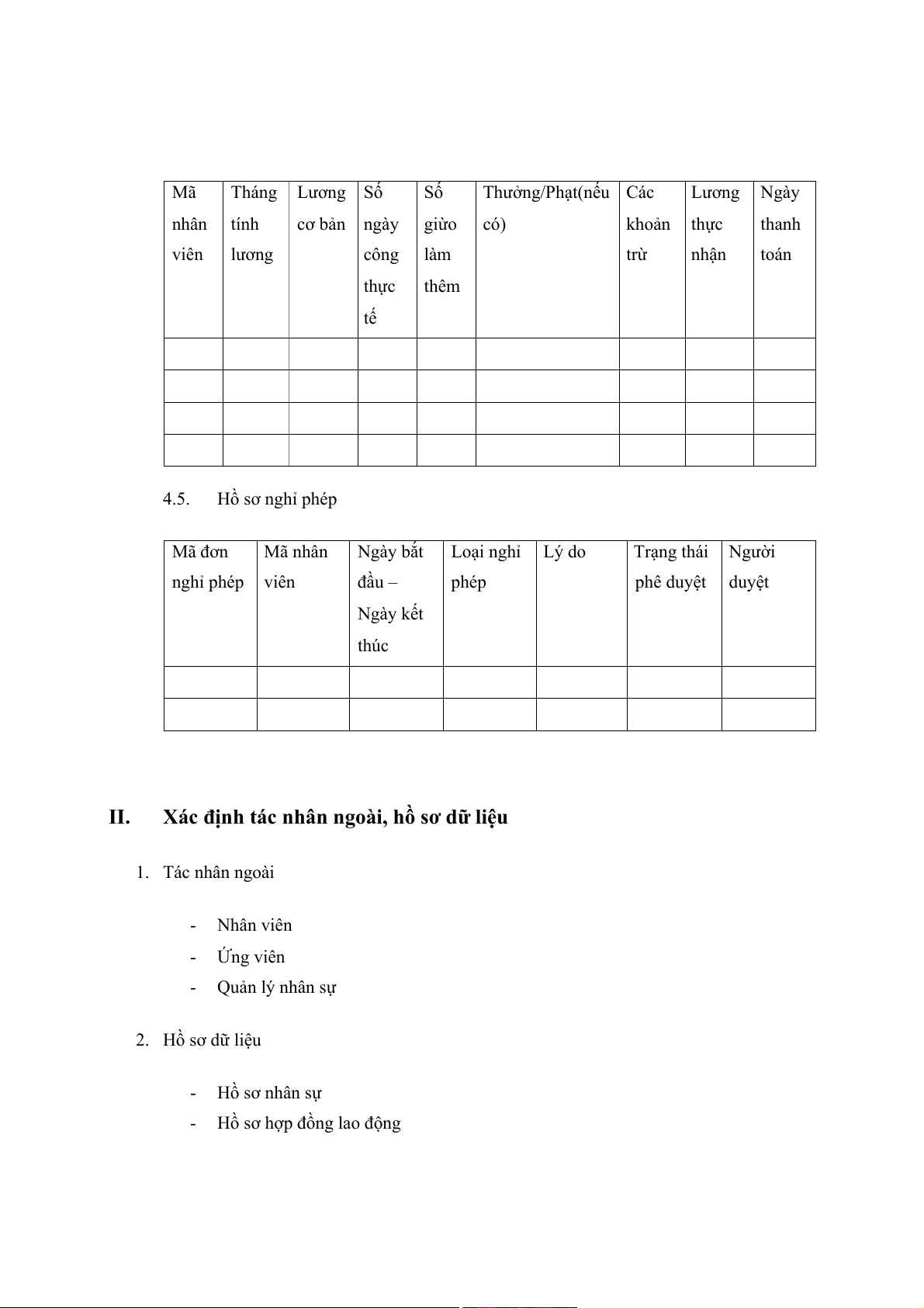 Hồ sơ hợp đồng lao động Mã hợp Mã nhân Loại hợp Ngày bắt Điều Trạng thái đồng viên đồng đầu – khoản hợp hợp đồng Ngày kết đồng thúc 4.3. Hồ sơ chấm công Mã nhân Ngày làm Giờ check- Số ngày làm Ngày nghỉ Ghi chú viên việc in , Giờ việc thực tế phép, ốm, check-out nghỉ không lương 4.4. Hồ sơ tính lương Mã Tháng Lương Số Số Thưởng/Phạt(nếu Các Lương Ngày nhân tính cơ bản ngày giừo có) khoản thực thanh viên lương công làm trừ nhận toán thực thêm tế 4.5. Hồ sơ nghỉ phép Mã đơn Mã nhân Ngày bắt Loại nghỉ Lý do Trạng thái Người nghỉ phép viên đầu – phép phê duyệt duyệt Ngày kết thúc II.