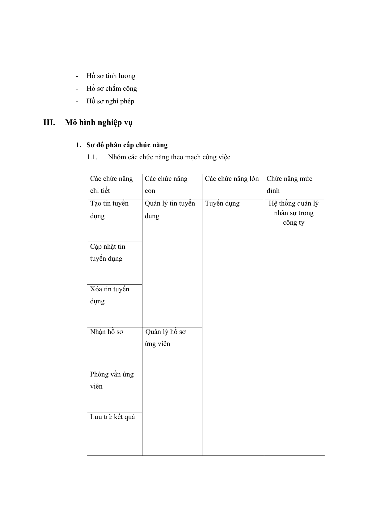 Hồ sơ hợp đồng lao động - Hồ sơ tính lương - Hồ sơ chấm công - Hồ sơ nghỉ phép III. Mô hình nghiệp vụ