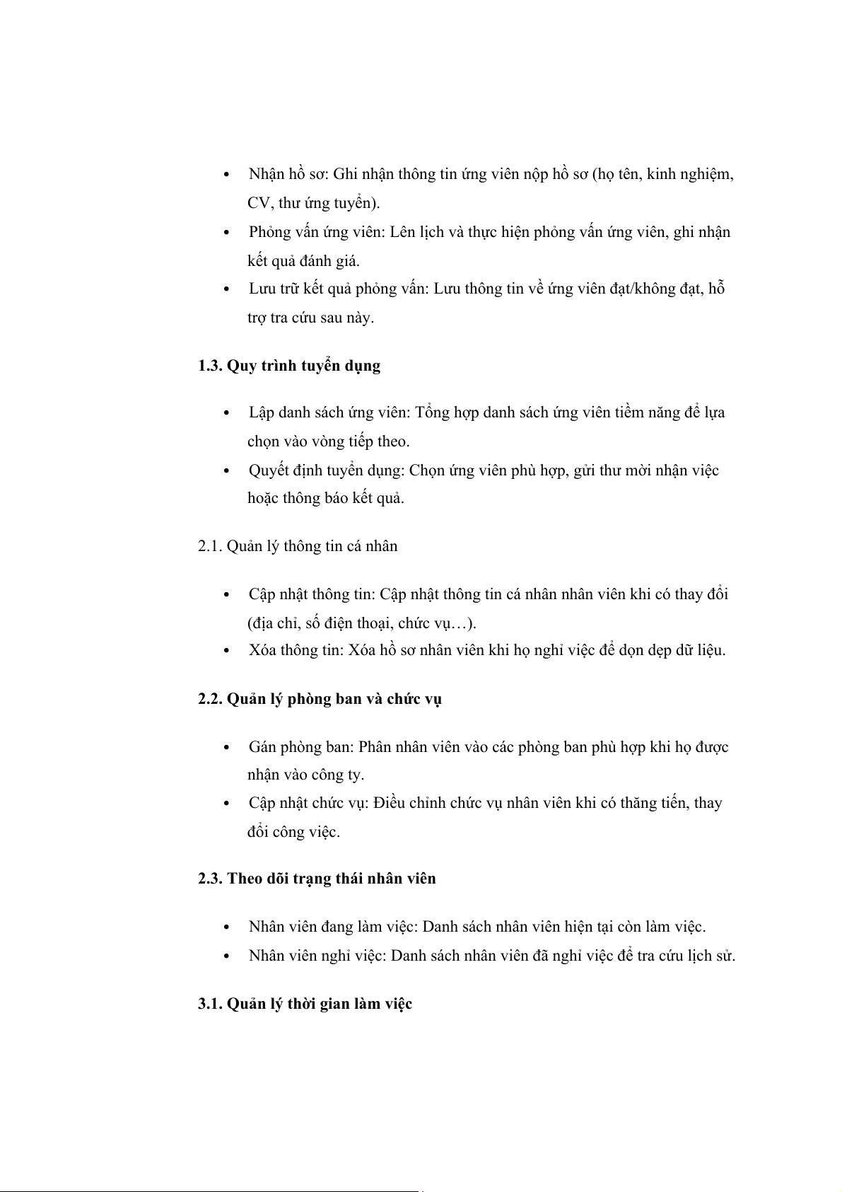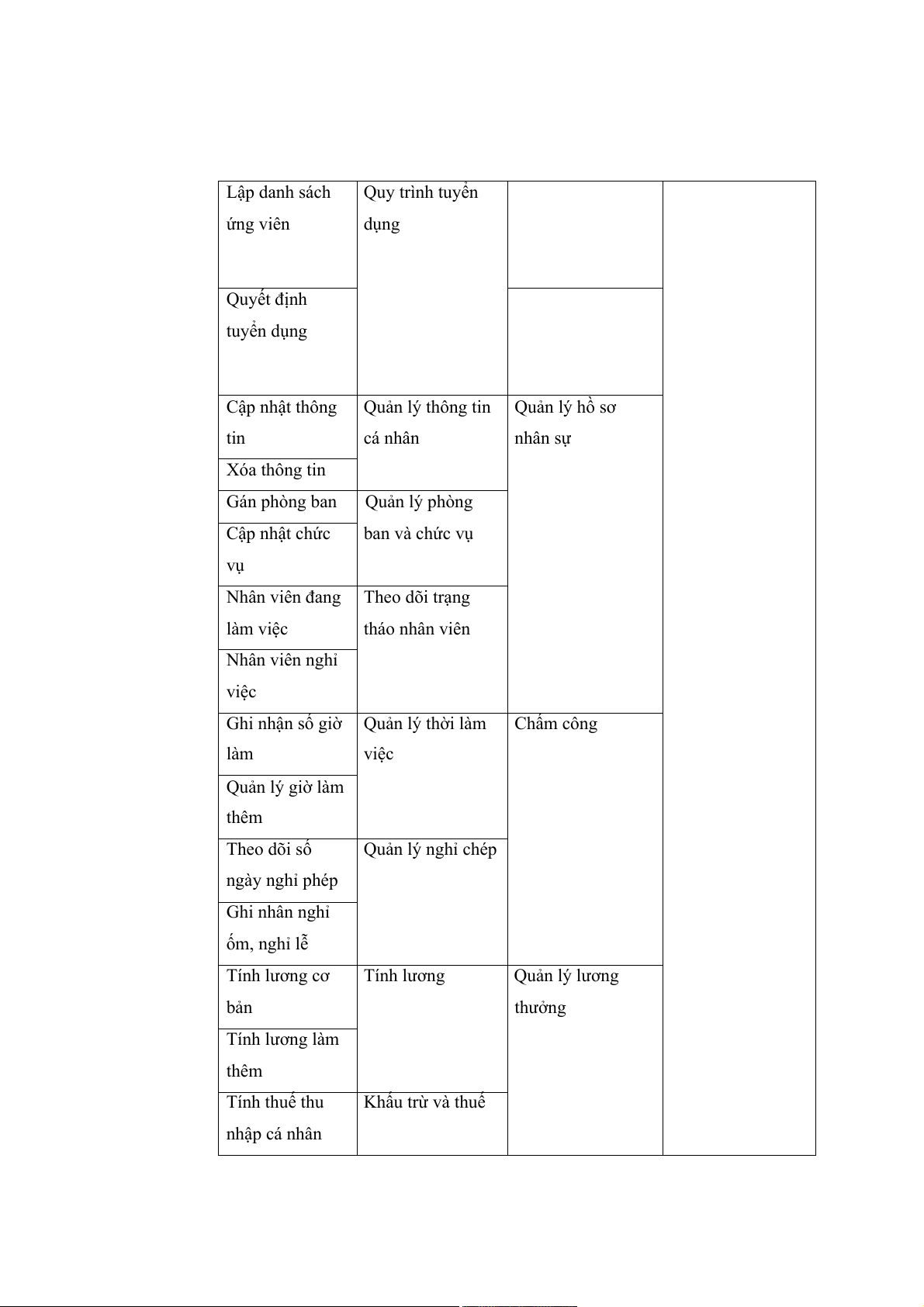 Quản lý hồ sơ nhân sự 2.2. Tuyển dụng 2.3. Quản lý chấm công 2.4. Quản lý lương thưởng 2.5.