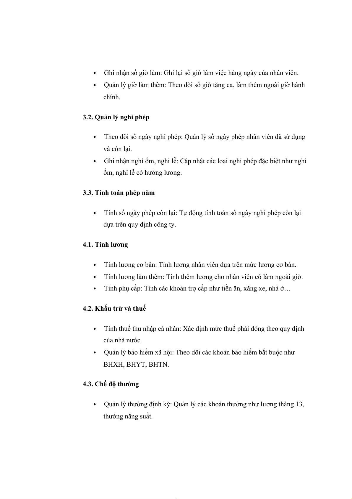 Ghi nhận số giờ Quản lý thời làm Chấm công làm việc Quản lý giờ làm thêm Theo dõi số Quản lý nghỉ chép ngày nghỉ phép Ghi nhân nghỉ ốm, nghỉ lễ Tính lương cơ Tính lương Quản lý lương bản thưởng Tính lương làm thêm Tính thuế thu Khấu trừ và thuế nhập cá nhân