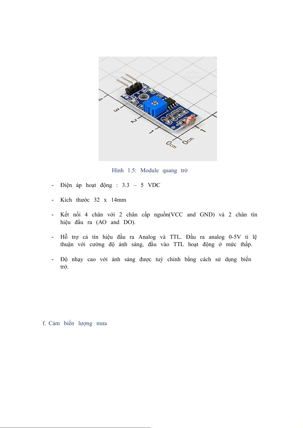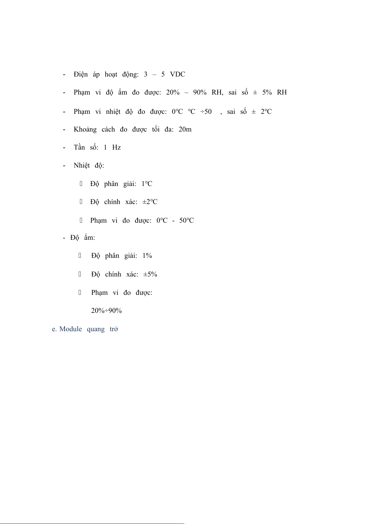 Phạm vi đo được: 0℃ - 50℃ - Độ ẩm: Độ phân giải: 1% Độ chính xác: ±5% Phạm vi đo được: 20%÷90% e. Module quang trở