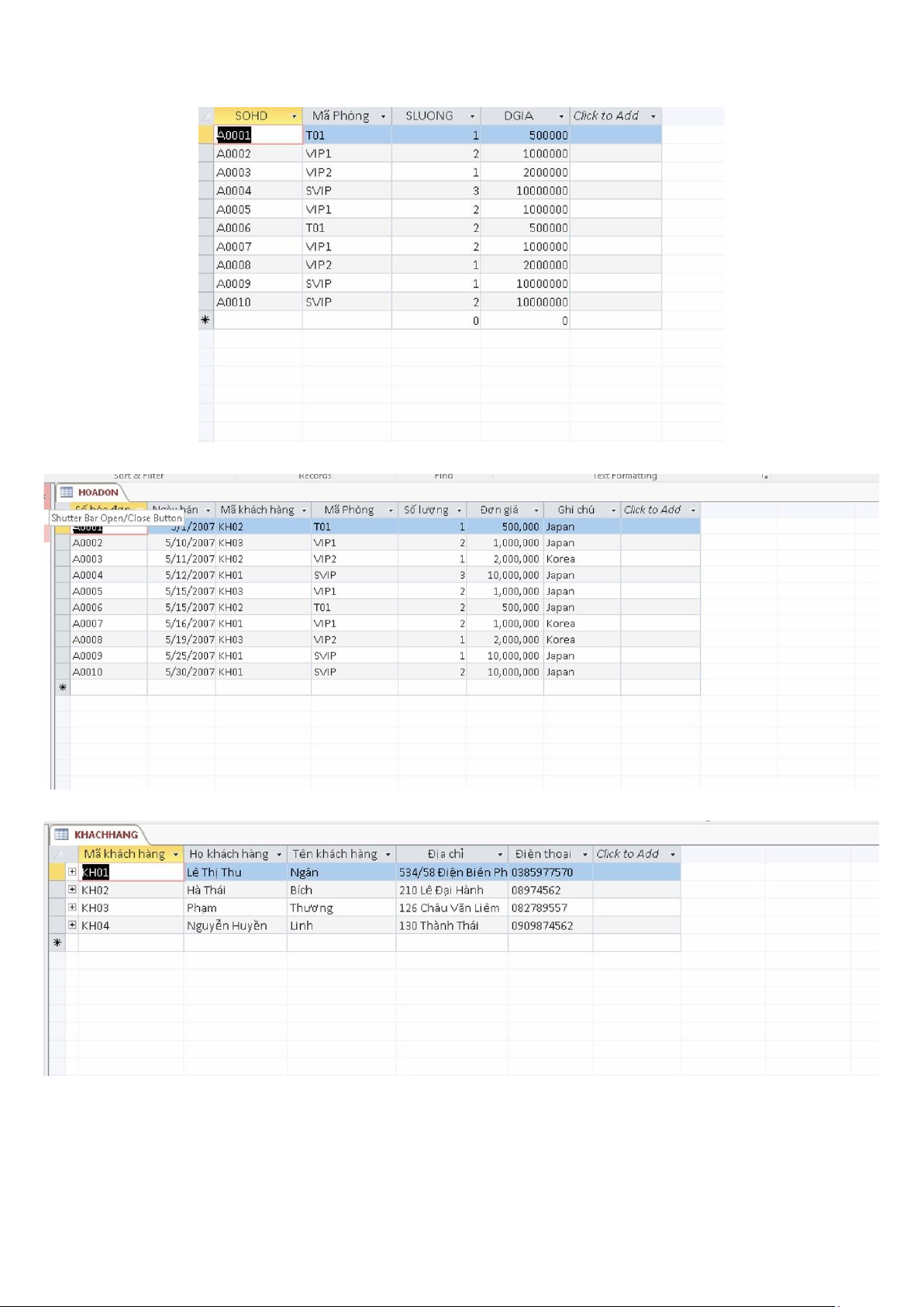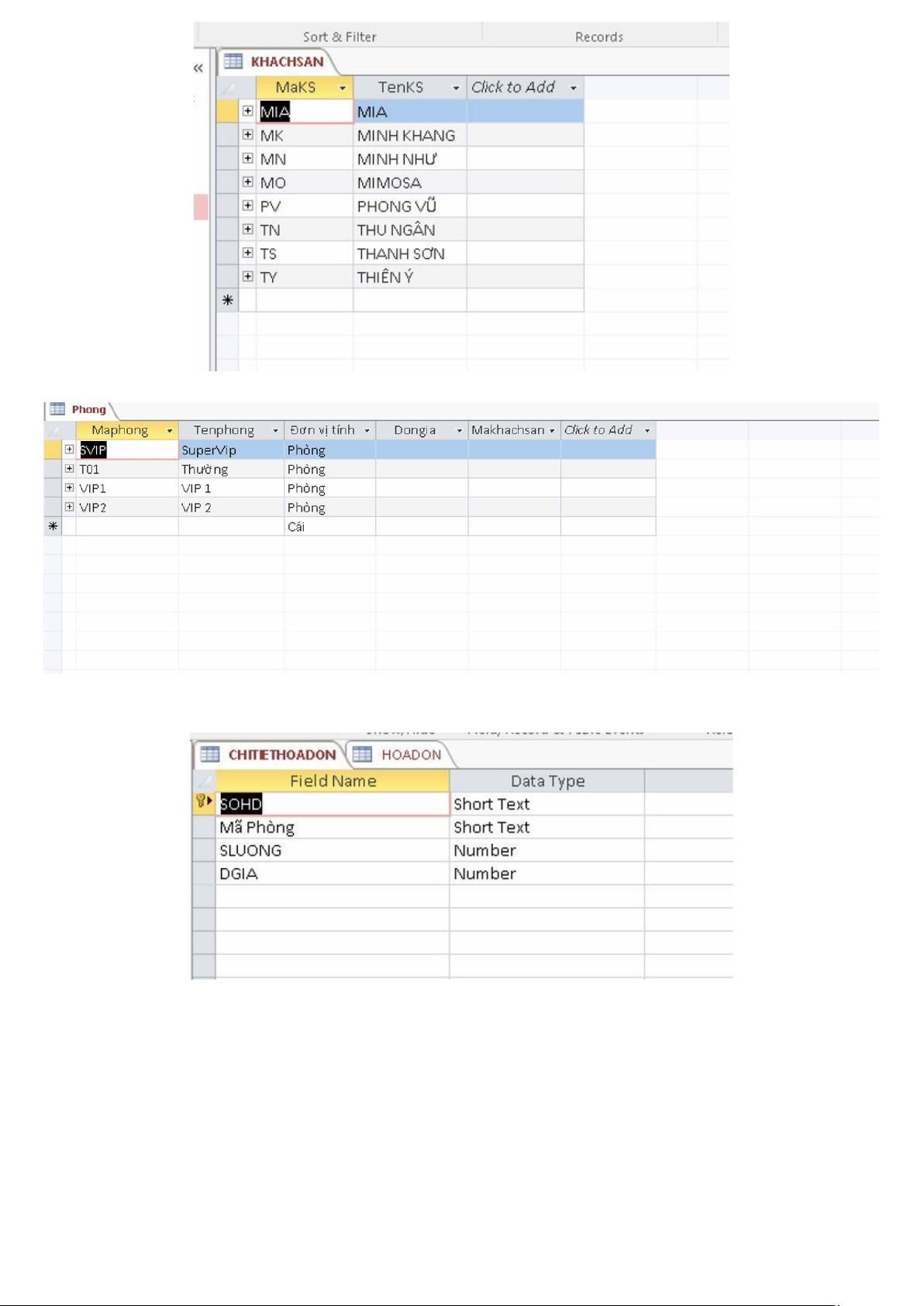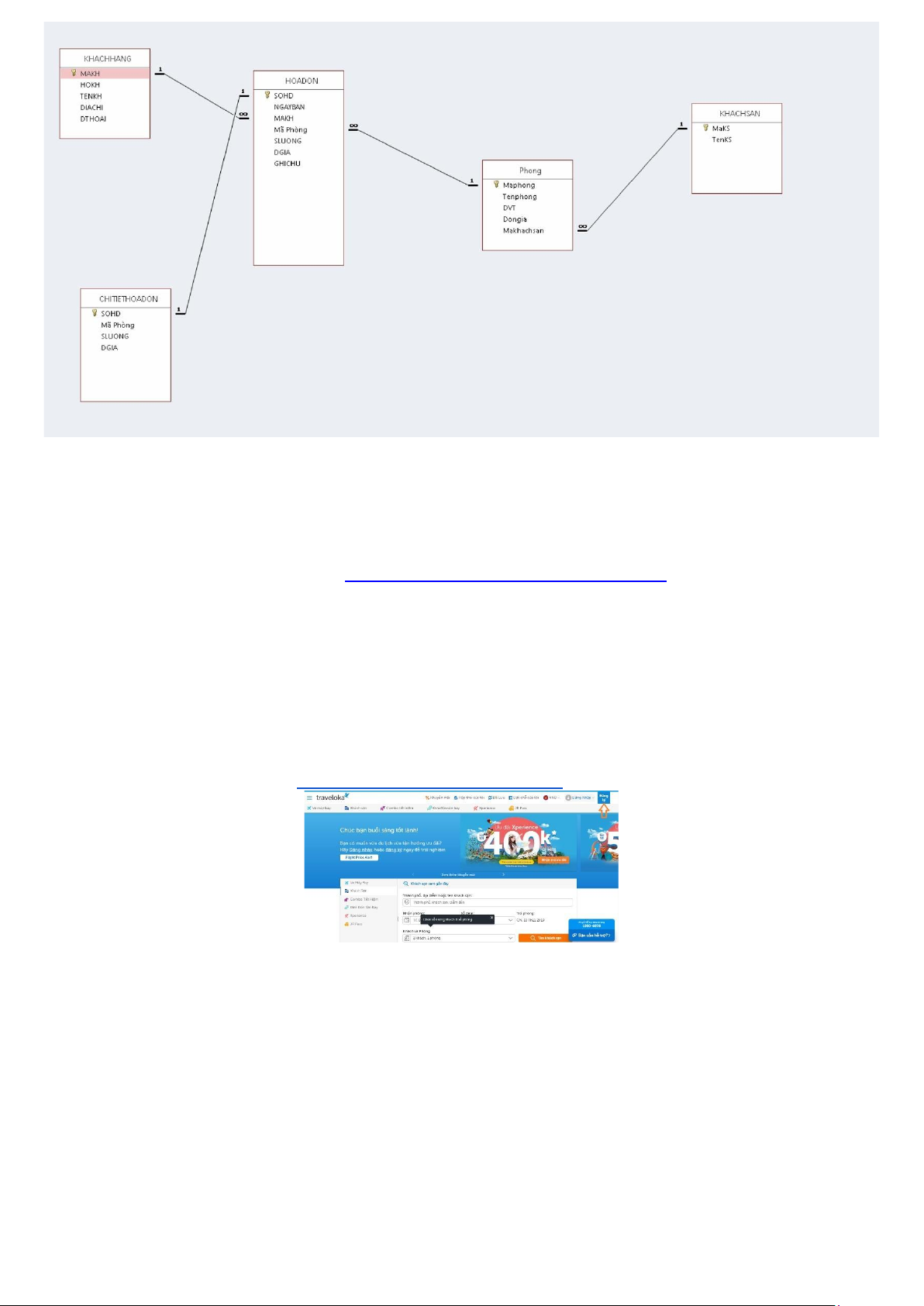 Phần 3: CƠ SỞ DỮ LIỆU CỦA CHỨC NĂNG ĐẶT PHÒNG TẠI TRAVELOKA: lOMoAR cPSD| 47206417 • DATASHEET VIEW: Chi tiết hoá đơn: Hoá đơn: Khách hàng: Khách sạn: lOMoAR cPSD| 47206417 Phòng: • Design View: Chi tiết hoá đơn: Hoá đơn: lOMoAR cPSD| 47206417 Khách hàng: Khách sạn: Phòng: • Relationship: lOMoAR cPSD| 47206417