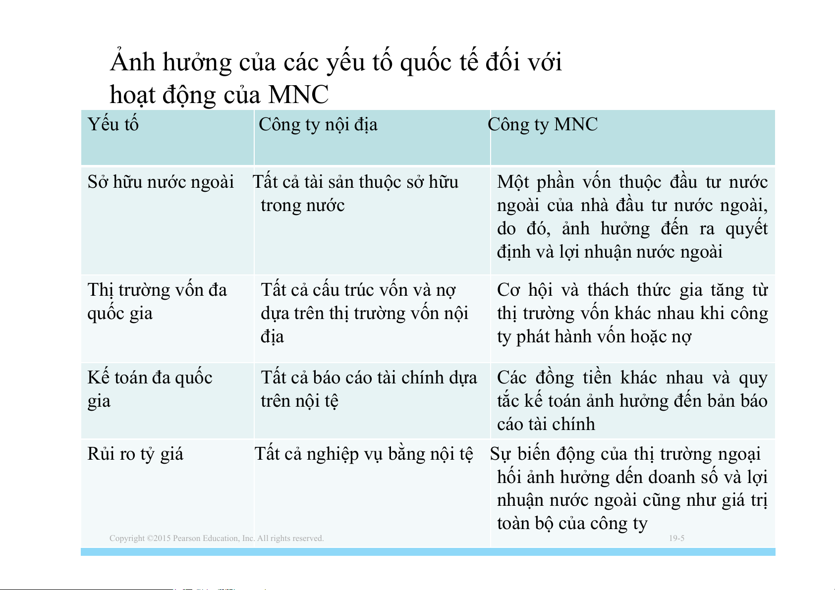 Ảnh hưởng của các yếu tố quốc tế đối với hoạt động của MNC Yếu tố Công ty nội địa Công ty MNC