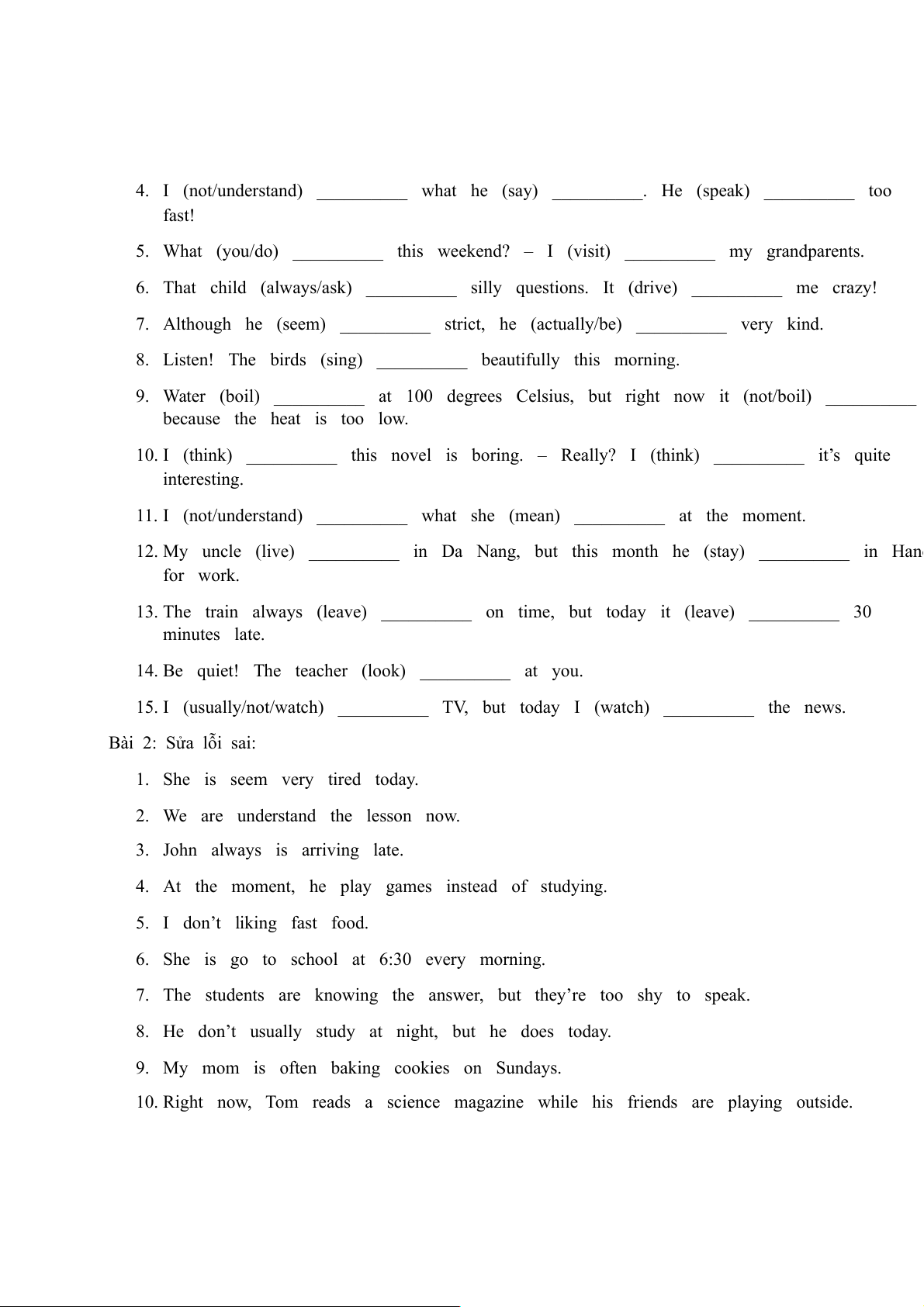 Bài 1: Điền dạng đúng của động từ trong ngoặc (Hiện tại đơn hoặc hiện tại tiếp diễn):