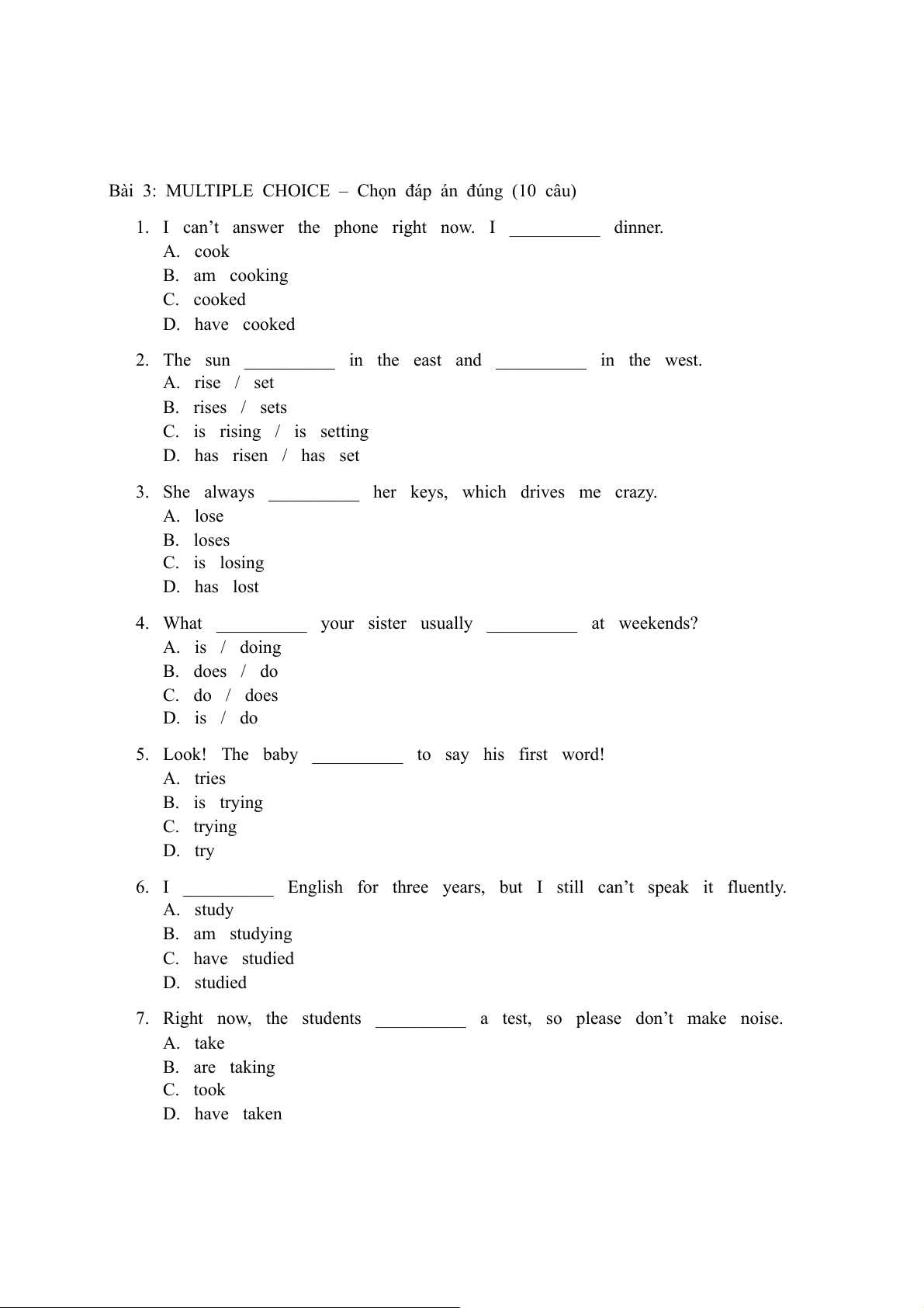 Bài 3: MULTIPLE CHOICE – Chọn đáp án đúng (10 câu)
