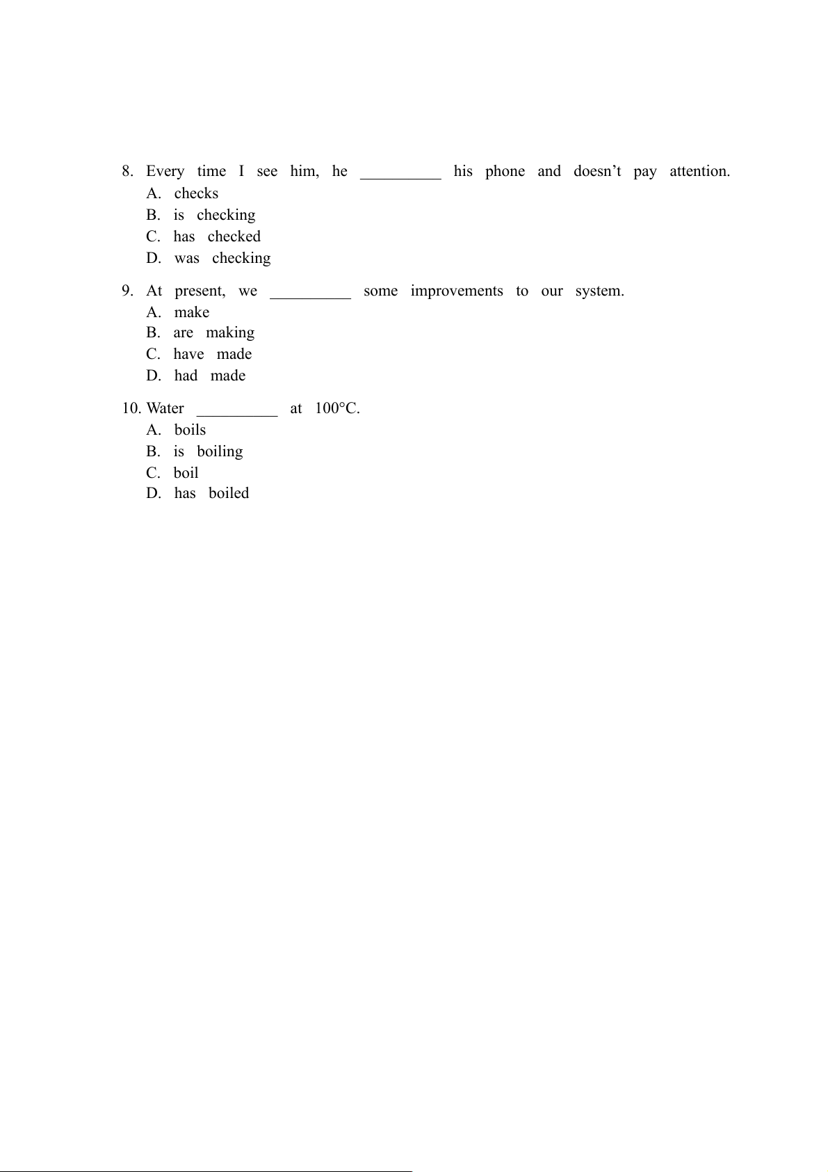 8. Every time I see him, he __________ his phone and doesn’t pay attention. A. checks B. is checking C. has checked D. was checking