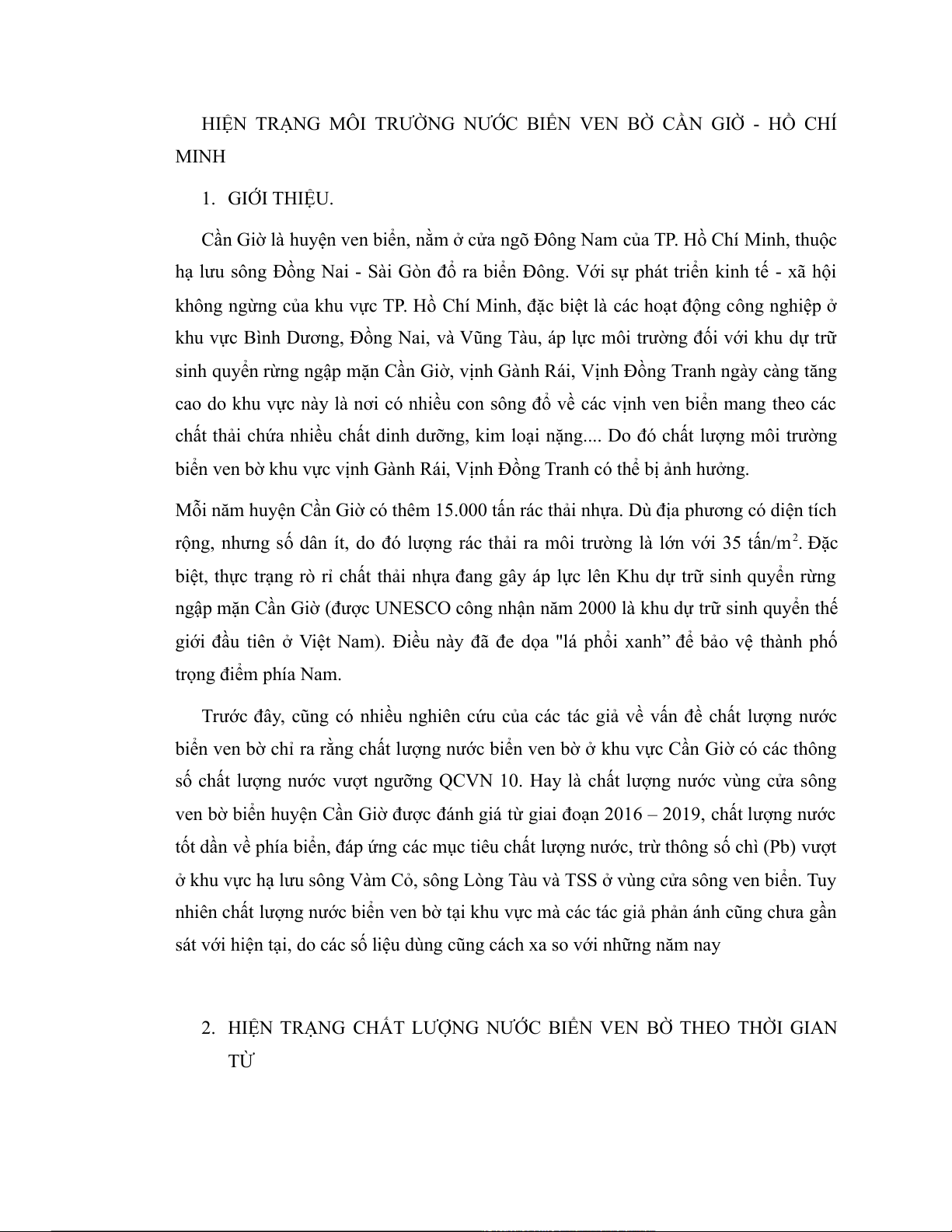 HIỆN TRẠNG MÔI TRƯỜNG NƯỚC BIỂN VEN BỜ CẦN GIỜ - HỒ CHÍ MINH 1. GIỚI THIỆU.