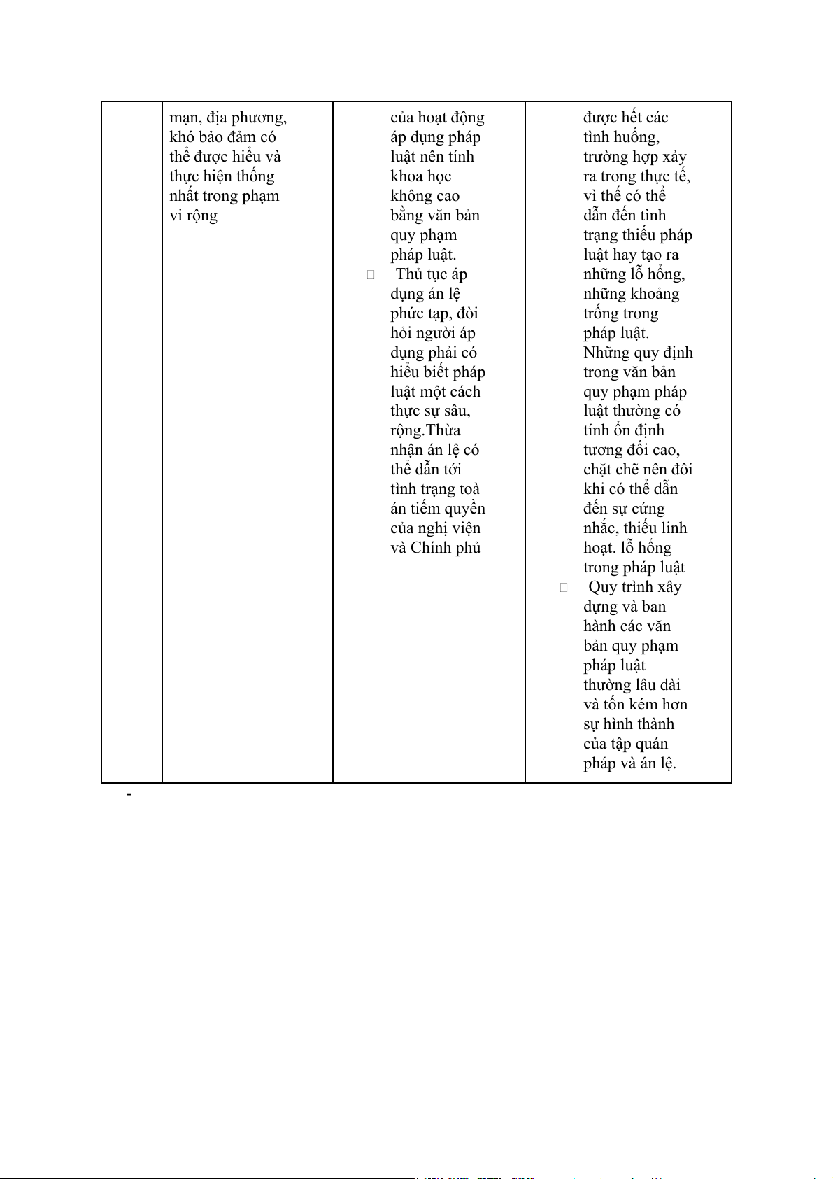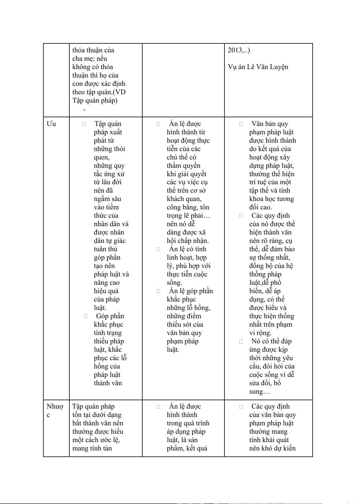 cơ bản hoặc cần thiết. của mẹ đẻ theo trong chai bia gừng (VD: Hiến pháp thỏa thuận của 2013,..) cha mẹ; nếu không có thỏa Vụ án Lê Văn Luyện thuận thì họ của con được xác định theo tập quán.(VD Tập quán pháp) - Ưu Tập quán Án lệ được Văn bản quy pháp xuất hình thành từ phạm pháp luật phát từ hoạt động thực được hình thành những thói tiễn của các do kết quả của quen, chủ thể có hoạt động xây những quy thẩm quyền dựng pháp luật, tắc ứng xử khi giải quyết thường thể hiện từ lâu đời các vụ việc cụ trí tuệ của một nên đã thể trên cơ sở tập thể và tính ngấm sâu khách quan, khoa học tương vào tiềm công bằng, tôn đối cao. thức của trọng lẽ phải… Các quy định nhân dân và nên nó dễ của nó được thể được nhân dàng được xã hiện thành văn dân tự giác hội chấp nhận. nên rõ ràng, cụ tuân thủ Án lệ có tính thể, dễ đảm bảo góp phần linh hoạt, hợp sự thống nhất, tạo nên lý, phù hợp với đồng bộ của hệ pháp luật và thực tiễn cuộc thống pháp nâng cao sống. luật,dễ phổ hiệu quả Án lệ góp phần biến, dễ áp của pháp khắc phục dụng, có thể luật. những lỗ hổng, được hiểu và Góp phần những điểm thực hiện thống khắc phục thiếu sót của nhất trên phạm tình trạng văn bản quy vi rộng. thiếu pháp phạm pháp Nó có thể đáp luật, khắc luật. ứng được kịp phục các lỗ thời những yêu hổng của cầu, đòi hỏi của pháp luật cuộc sống vì dễ thành văn sửa đối, bổ sung… Nhượ Tập quán pháp Án lệ được Các quy định c tồn tại dưới dạng hình thành của văn bản quy bất thành văn nên trong quá trình phạm pháp luật thường được hiếu áp dụng pháp thường mang một cách ước lệ, luật, là sản tính khái quát mang tính tản phẩm, kết quả nên khó dự kiến mạn, địa phương, của hoạt động được hết các khó bảo đảm có áp dụng pháp tình huống, thể được hiểu và luật nên tính trường hợp xảy thực hiện thống khoa học ra trong thực tế, nhất trong phạm không cao vì thế có thể vi rộng bằng văn bản dẫn đến tình quy phạm trạng thiếu pháp pháp luật. luật hay tạo ra Thủ tục áp những lỗ hổng, dụng án lệ những khoảng phức tạp, đòi trống trong hỏi người áp pháp luật. dụng phải có Những quy định hiểu biết pháp trong văn bản luật một cách quy phạm pháp thực sự sâu, luật thường có rộng.Thừa tính ổn định nhận án lệ có tương đối cao, thể dẫn tới chặt chẽ nên đôi tình trạng toà khi có thể dẫn án tiếm quyền đến sự cứng của nghị viện nhắc, thiếu linh và Chính phủ hoạt. lỗ hổng trong pháp luật Quy trình xây dựng và ban hành các văn bản quy phạm pháp luật thường lâu dài và tốn kém hơn sự hình thành của tập quán pháp và án lệ. -