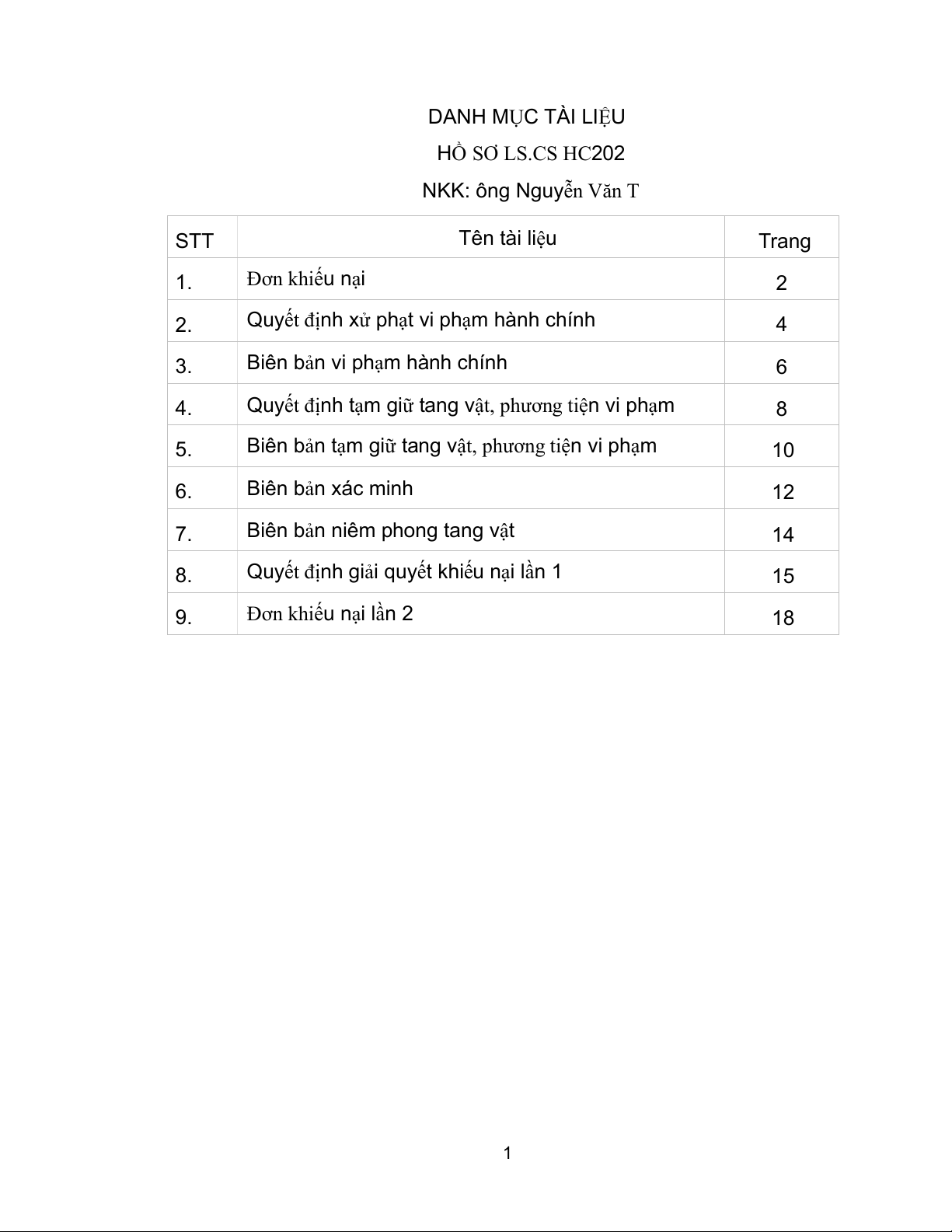 - Người nào sử dụng vào mục đích khác phải hoàn toàn chịu trách nhiệm. DANH MỤC TÀI LIỆU HỒ SƠ LS.CS HC202 NKK: ông Nguyễn Văn T STT Tên tài liệu Trang 1. Đơn khiếu nại 2 2.