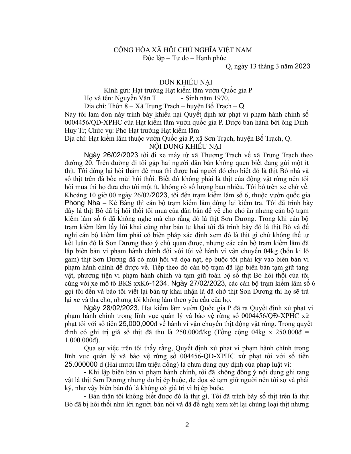 Địa chỉ: Hạt kiểm lâm thuộc vườn Quốc gia P, xã Sơn Trạch, huyện Bố Trạch, Q. NỘI DUNG KHIẾU NẠI