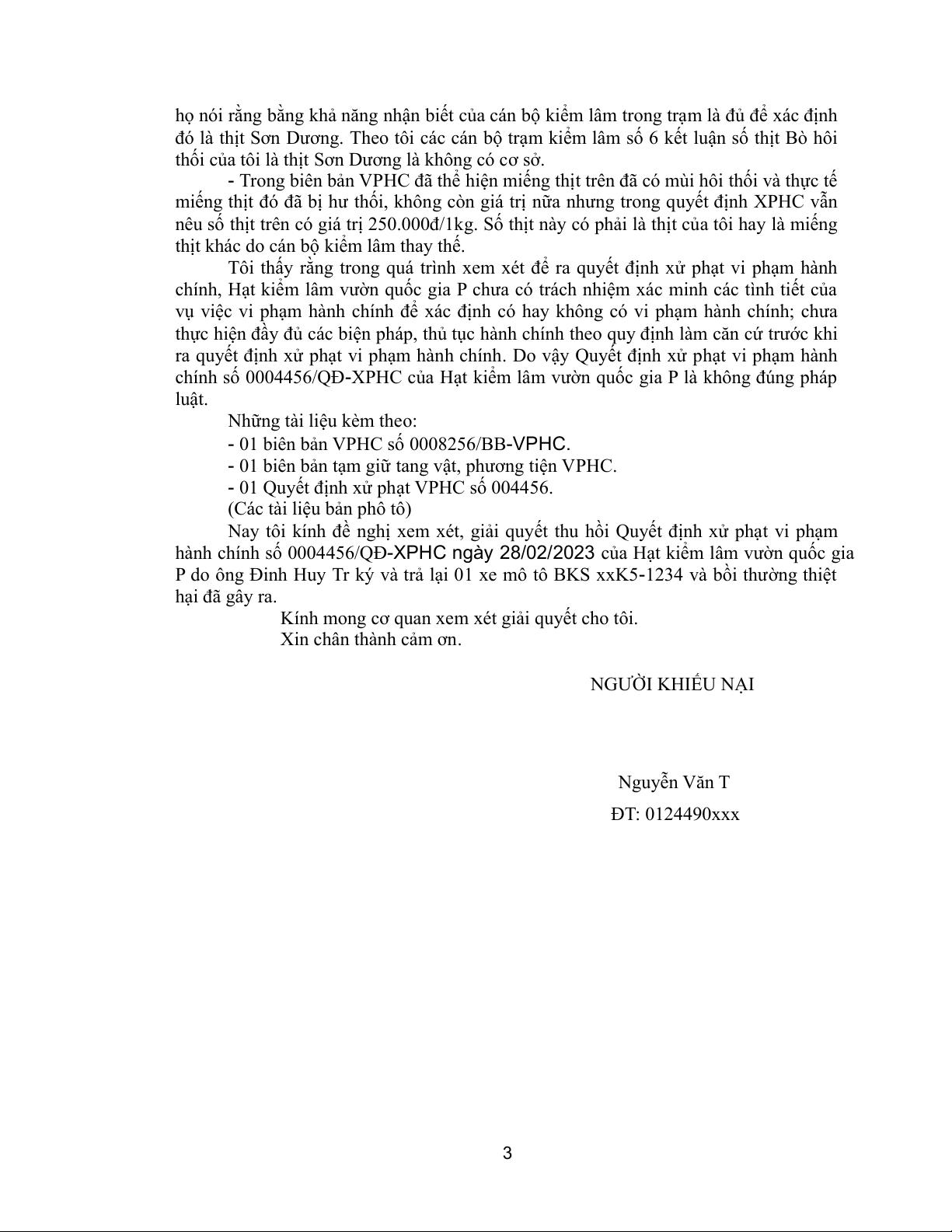 Kính mong cơ quan xem xét giải quyết cho tôi. Xin chân thành cảm ơn. NGƯỜI KHIẾU NẠI Nguyễn Văn T ĐT: 0124490xxx 3 BQL VQG P