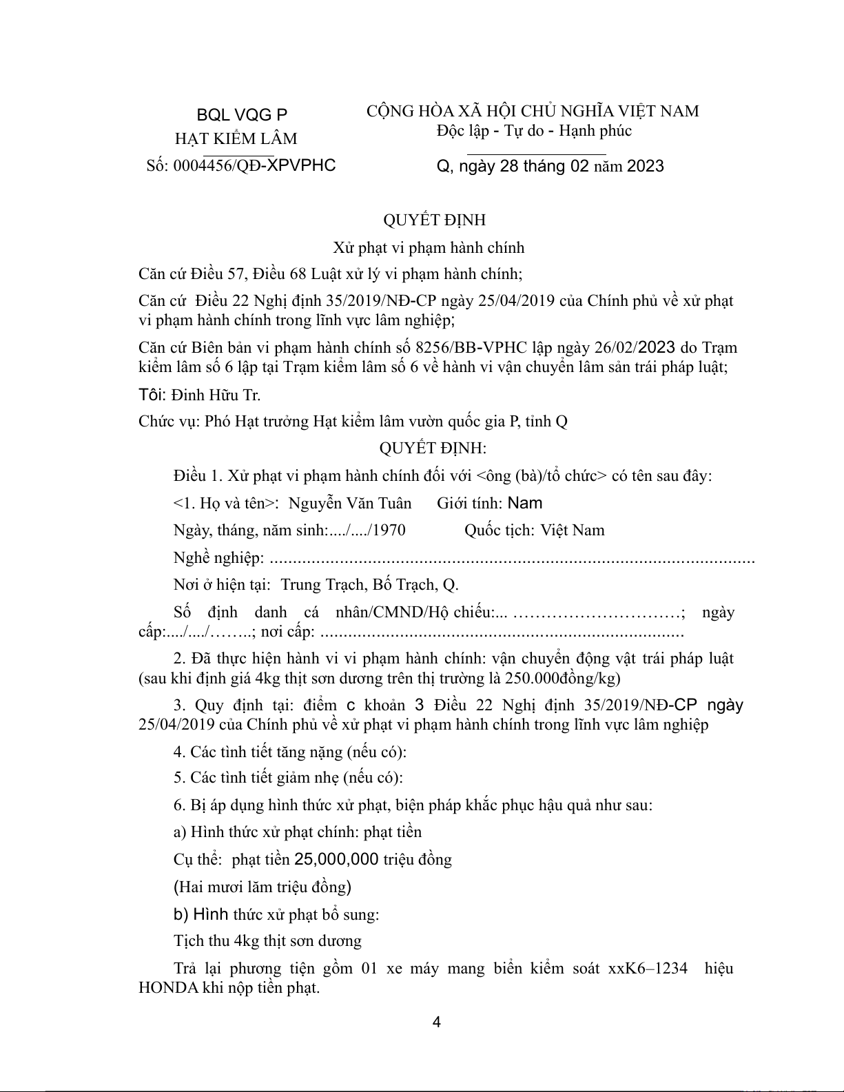 0004456/QĐ-XPHC của Hạt kiểm lâm vườn quốc gia P. Được ban hành bởi ông Đinh