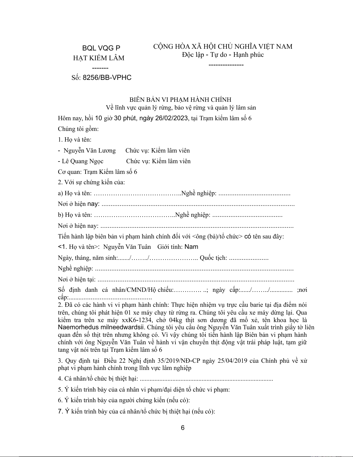 Hôm nay, hồi 10 giờ 30 phút, ngày 26/02/2023, tại Trạm kiểm lâm số 6 Chúng tôi gồm: 1. Họ và tên: