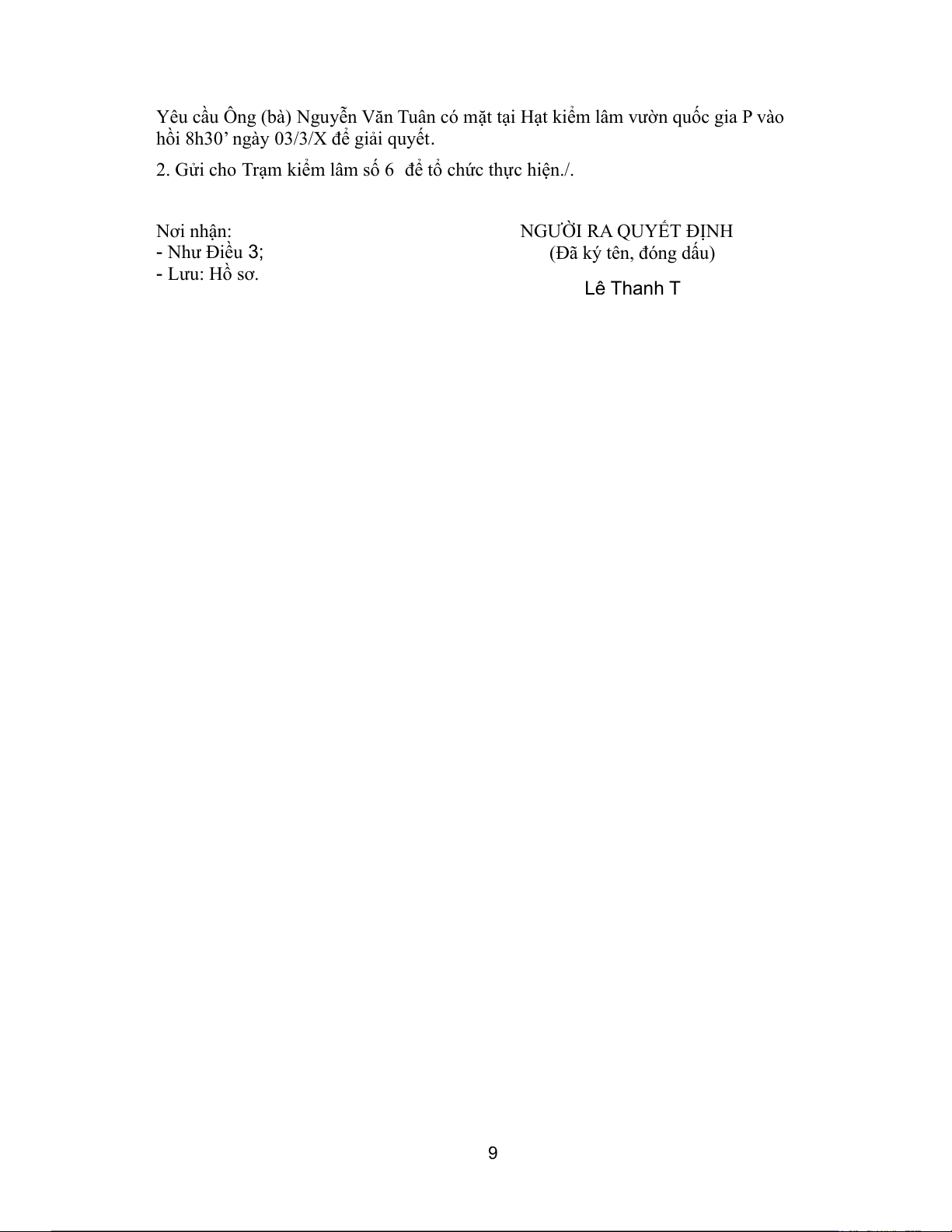 2. Gửi cho Trạm kiểm lâm số 6 để tổ chức thực hiện./. Nơi nhận: NGƯỜI RA QUYẾT ĐỊNH - Như Điều 3; (Đã ký tên, đóng dấu) - Lưu: Hồ sơ. Lê Thanh T 9