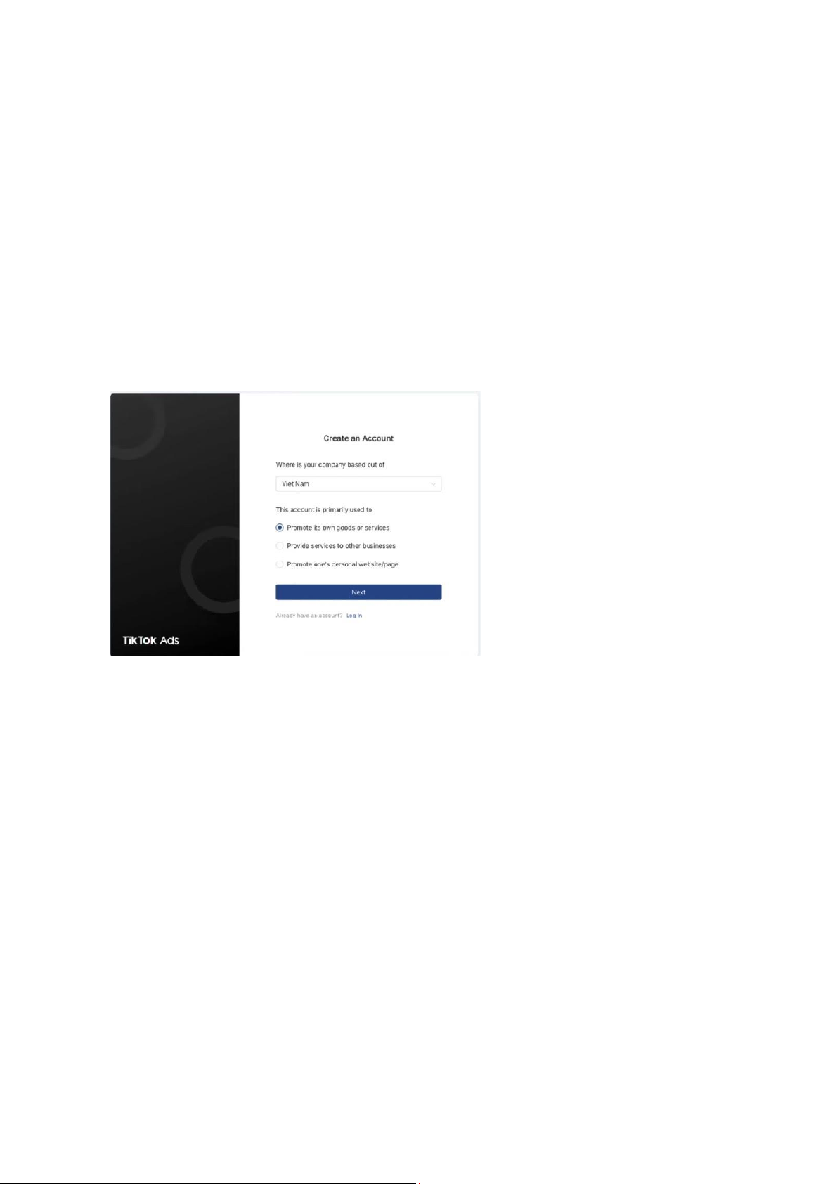 Đầu tiên chúng ta tạo tài khoản quảng cáo tik tok của mình và chỉ cần thực hiện