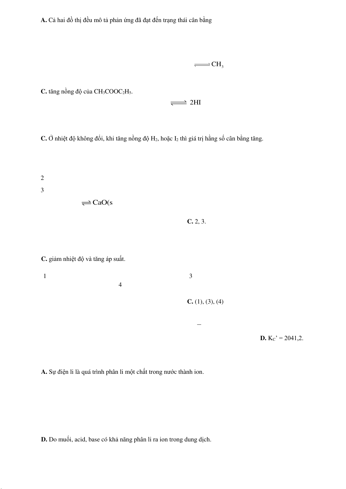 Khi giảm nhiệt độ hoặc tăng áp suất những cân bằng nào trên đây đều chuyển dịch theo chiều thuận? A. 1, 2. B. 1, 3, 4. C. 2, 3. D. 1, 3.