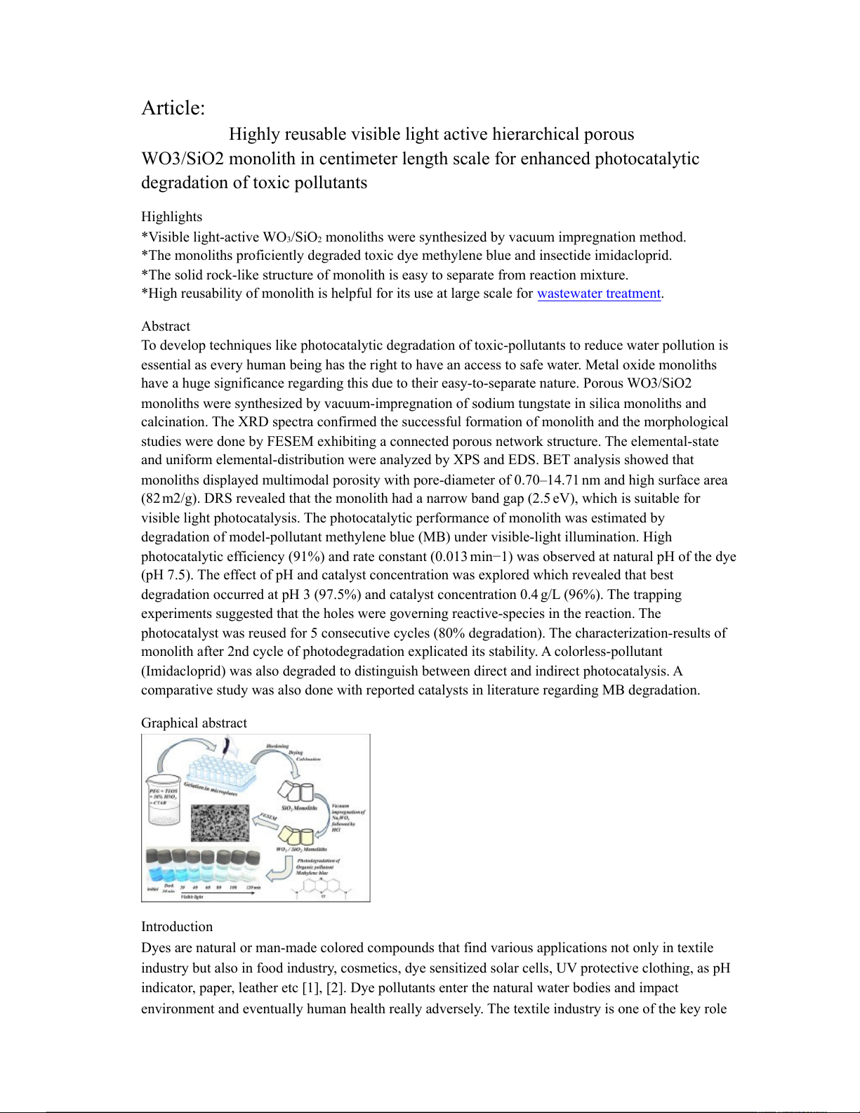 *High reusability of monolith is helpful for its use at large scale for wastewater treatment. Abstract