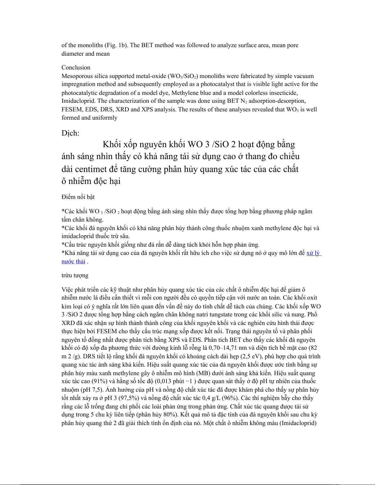 1. **Bền vững hóa học**: Cấu trúc nguyên khối của Wo3/SiO2 có thể có khả năng chống lại sự phân