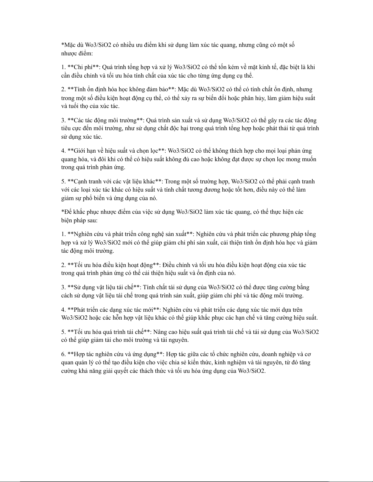 1. **Chi phí**: Quá trình tổng hợp và xử lý Wo3/SiO2 có thể tốn kém về mặt kinh tế, đặc biệt là khi