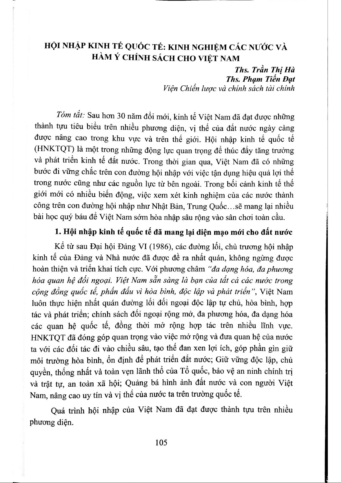 HỘI NHẬP KINH TẾ QUỐC TẾ: KINH NGHIỆM CÁC NƯỚC VÀ HÀM Ý CHÍNH SÁCH CHO VIỆT NAM