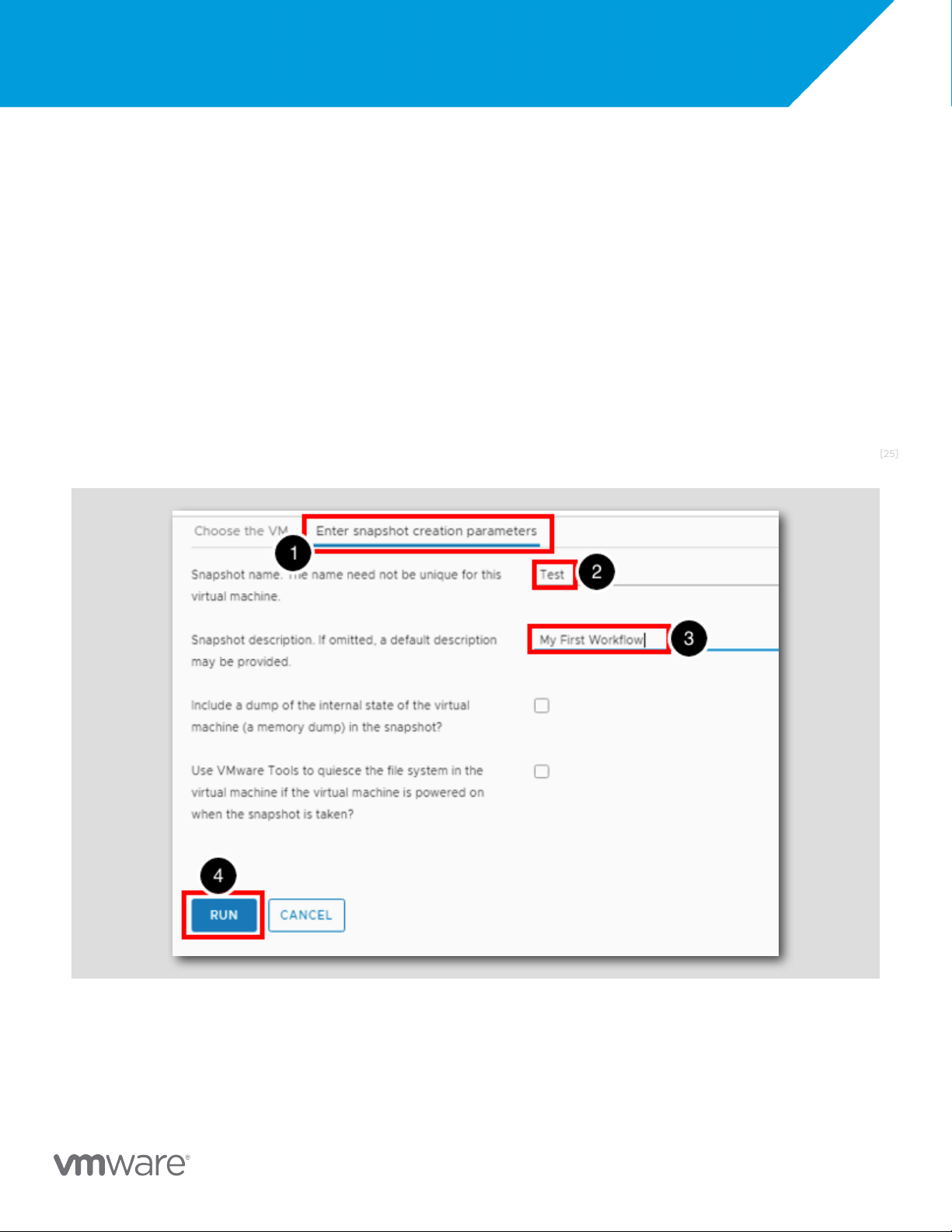 6.Now we have located the workflow we want to use let's start running it. For the workflow Create a snapshot, click the RUN button. [23]