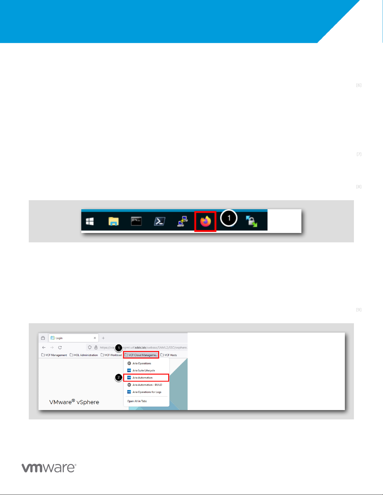 1. Click the VCF Cloud Management bookmark folder 2.Click Aria Automation. [10]