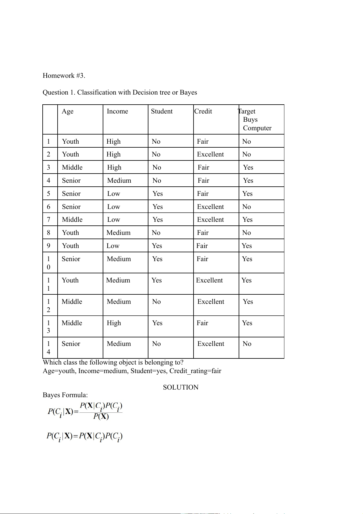 Question 1. Classification with Decision tree or Bayes Age Income Student Credit Target Buys Computer 1 Youth High No Fair No 2 Youth High No Excellent No 3 Middle High No Fair Yes 4 Senior Medium No Fair Yes 5 Senior Low Yes Fair Yes 6 Senior Low Yes Excellent No 7 Middle Low Yes Excellent Yes 8 Youth Medium No Fair No 9 Youth Low Yes Fair Yes 1 Senior Medium Yes Fair Yes 0 1 Youth Medium Yes Excellent Yes 1 1 Middle Medium No Excellent Yes 2 1 Middle High Yes Fair Yes 3 1 Senior Medium No Excellent No 4