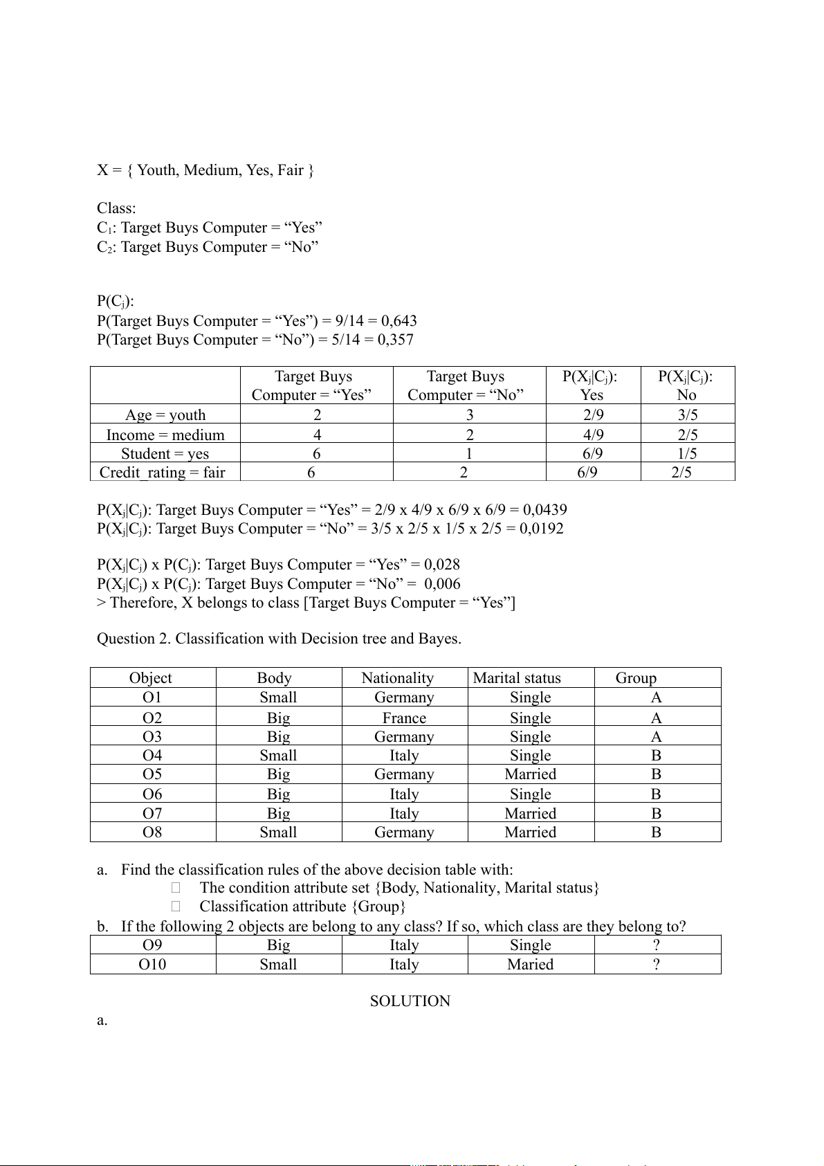 Question 2. Classification with Decision tree and Bayes. Object Body Nationality Marital status Group O1 Small Germany Single A O2 Big France Single A O3 Big Germany Single A O4 Small Italy Single B O5 Big Germany Married B O6 Big Italy Single B O7 Big Italy Married B O8 Small Germany Married B