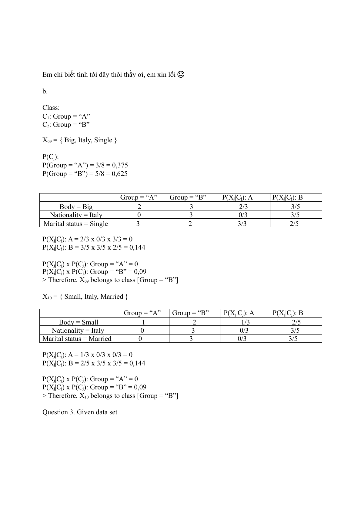 Em chỉ biết tính tới đây thôi thầy ơi, em xin lỗi ☹ b. Class: C1: Group = “A” C2: Group = “B” X09 = { Big, Italy, Single } P(Cj):