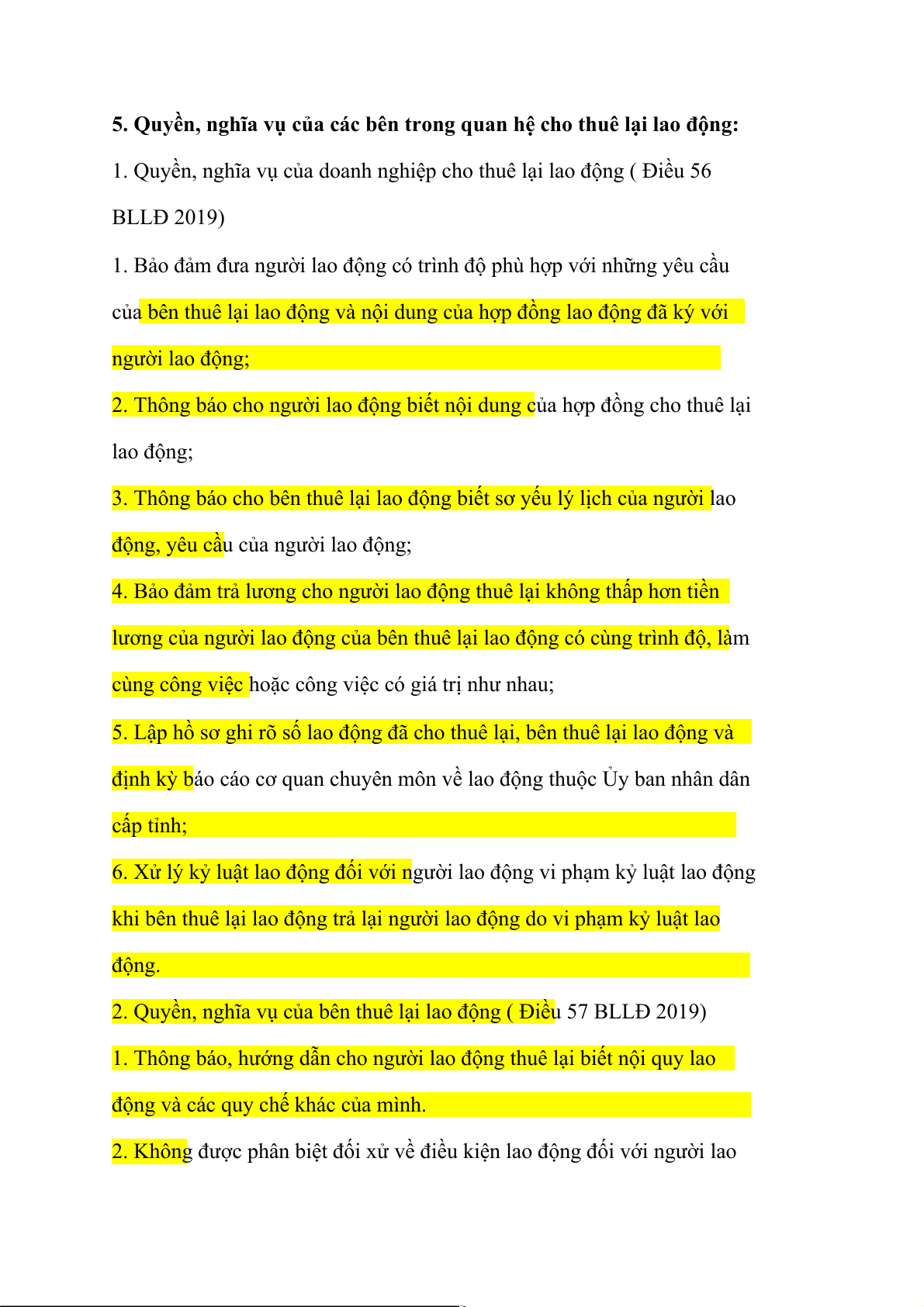 5. Quyền, nghĩa vụ của các bên trong quan hệ cho thuê lại lao động:
