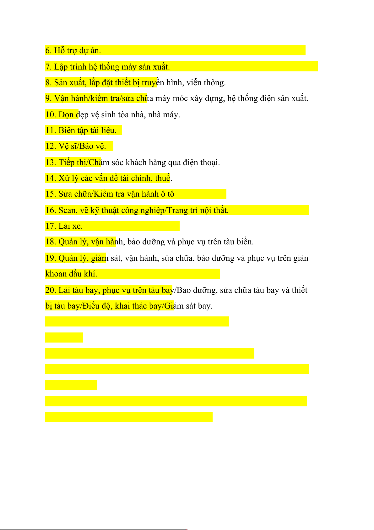 10. Dọn dẹp vệ sinh tòa nhà, nhà máy. 11. Biên tập tài liệu. 12. Vệ sĩ/Bảo vệ.