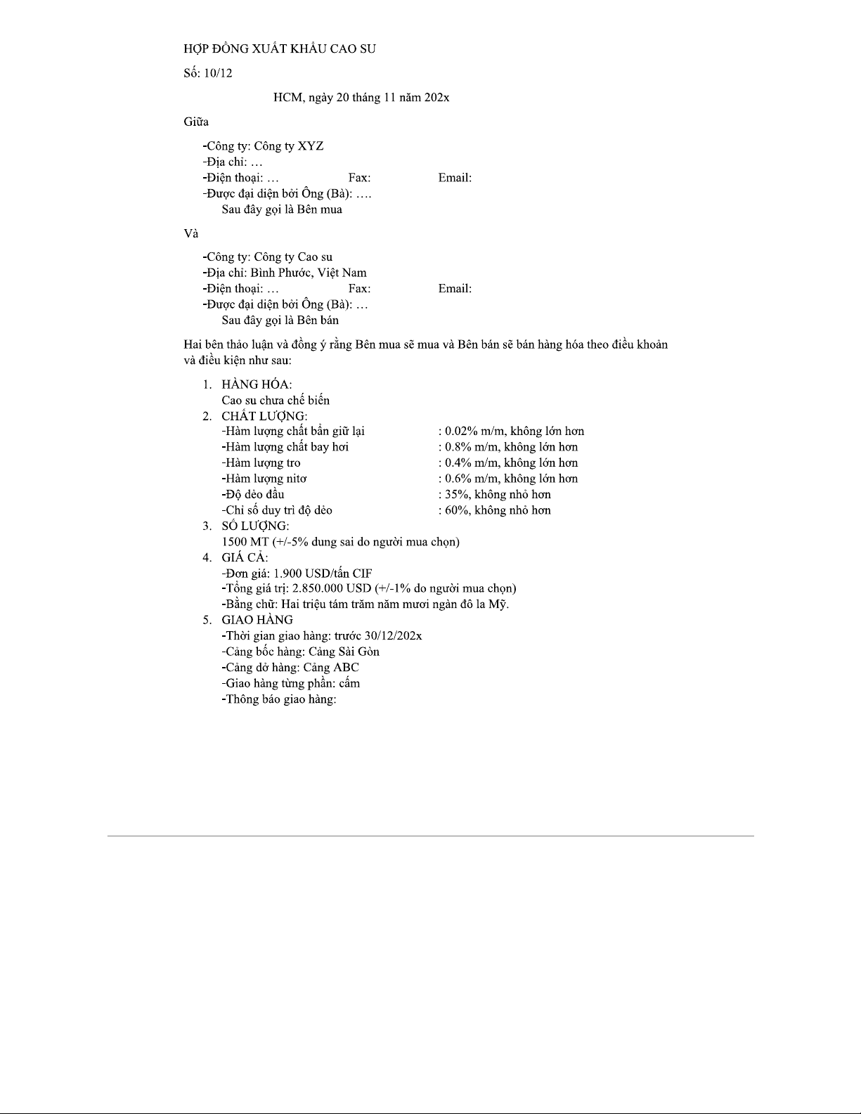 Hợp Đồng Xuất Khẩu Cao Su - Số 10/202x, Thương Mại Quốc Tế