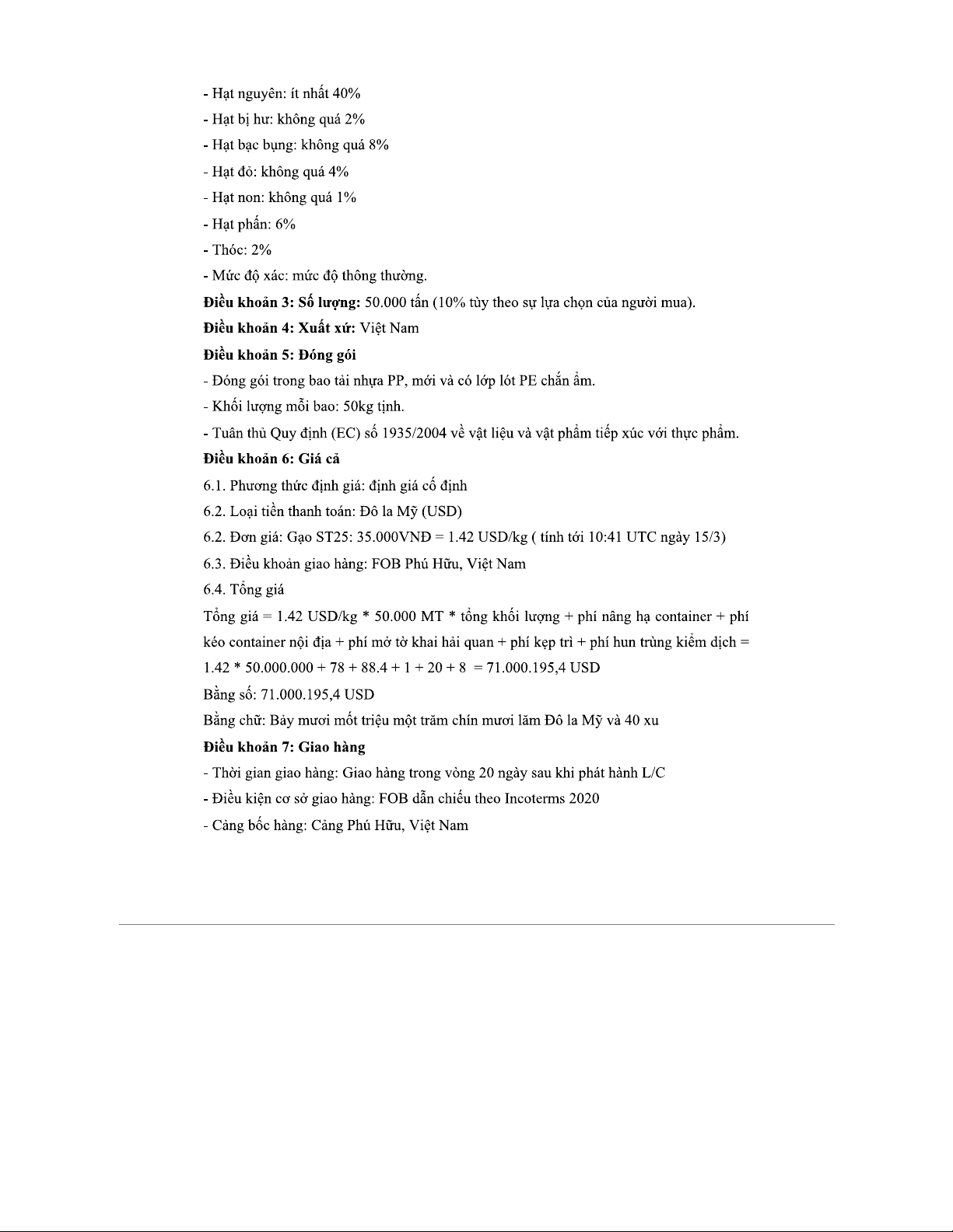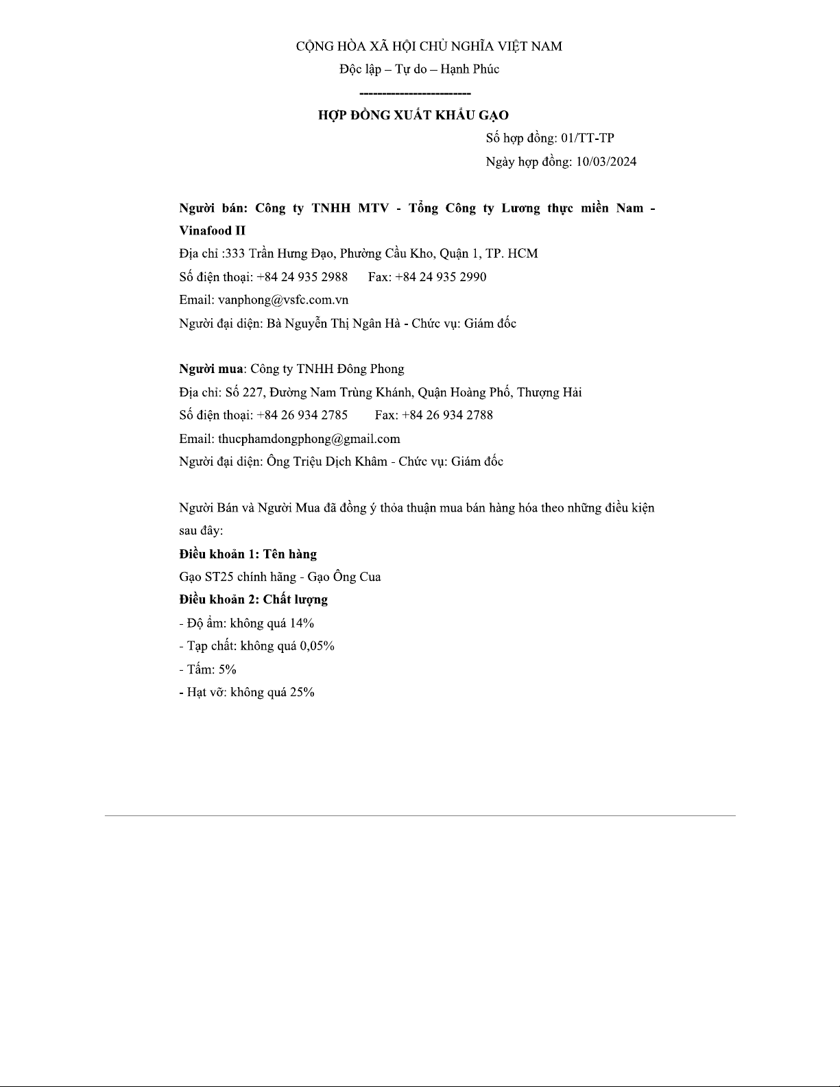 HỢP ĐỒNG XUẤT KHẨU GẠO - Nhóm 4 - Số 01/TT-TP, Ngày 10/03