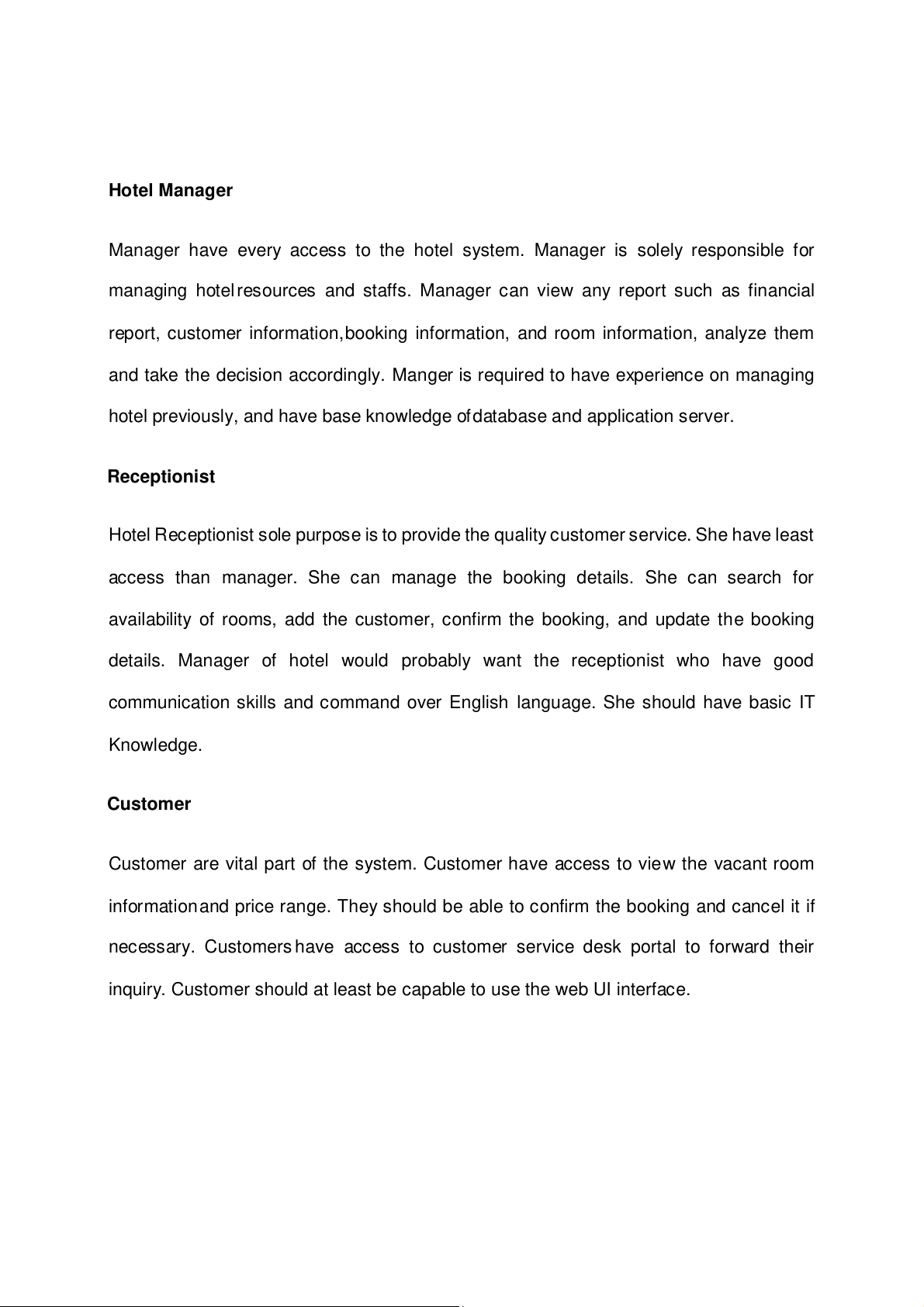 System wil have three end users: Customer, Receptionist, and Hotel Manager. Hotel