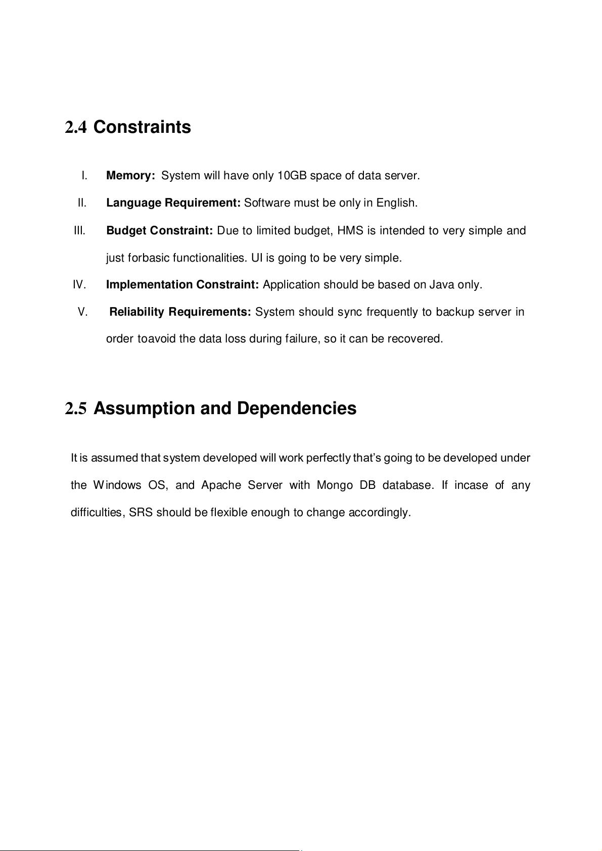 V. Reliability Requirements: System should sync frequently to backup server in